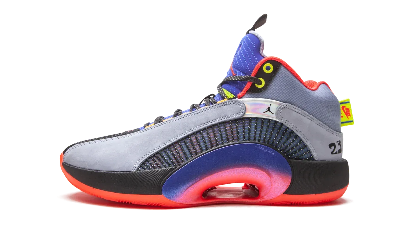 Mit dem Air Jordan 35 Center of Gravity bringt Air Jordan im Oktober 2020 eine Performance-Basketballschuh in einer neuen Farbgebung auf den Markt. Leichter als sein Vorgänger, bietet er dank des modernisierten Eclipse Plate und des neuen Flightwire Systems mit Kurim-Käfig verbesserte Leistungsfähigkeiten auf dem Platz. Das Design kombiniert graue Wildleder-Überzüge mit mehrfarbigen, halbtransparenten Paneelen und zitiert stilistisch den Air Jordan 5. Mit Zoom Air Einheiten in der Sohle bietet der Schuh reaktionsfähigen Komfort und Stil für Basketballspieler.