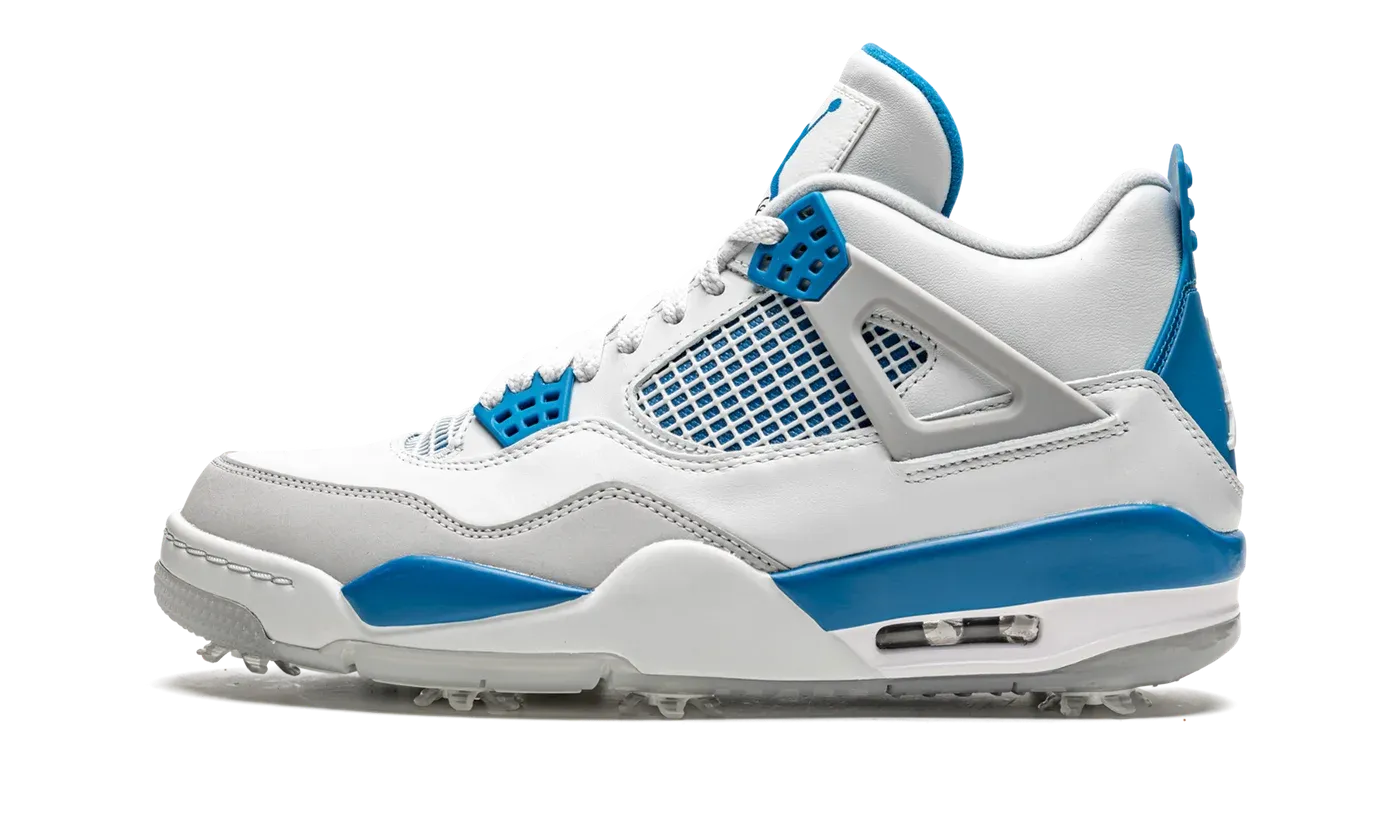 The Air Jordan 4 Golf "Military Blue" is the alternate version of the vintage basketball shoe designed for golf in an original Air Jordan colorway. The "Military Blue" was a launch colorway of the Air Jordan 4 back in 1989, and it appears here on the modified Jordan 4 Golf that features removable spikes for superior grip on the fairway. Replicating the look of the original "Military Blue" Jordan 4, the upper is constructed in white leather with Military Blue beneath the white netting on the mid-panel and tongue. The "wings" and forefoot overlay are cast in light grey hue. A white Jumpman with "Air" branding is found on the heel tab and a Military Blue Jumpman and black script "Flight" detailing appear on the tongue tag. Jordan Brand paints the midsole in Military Blue to match the rest of the shoe's accents. Release date: September 7, 2021