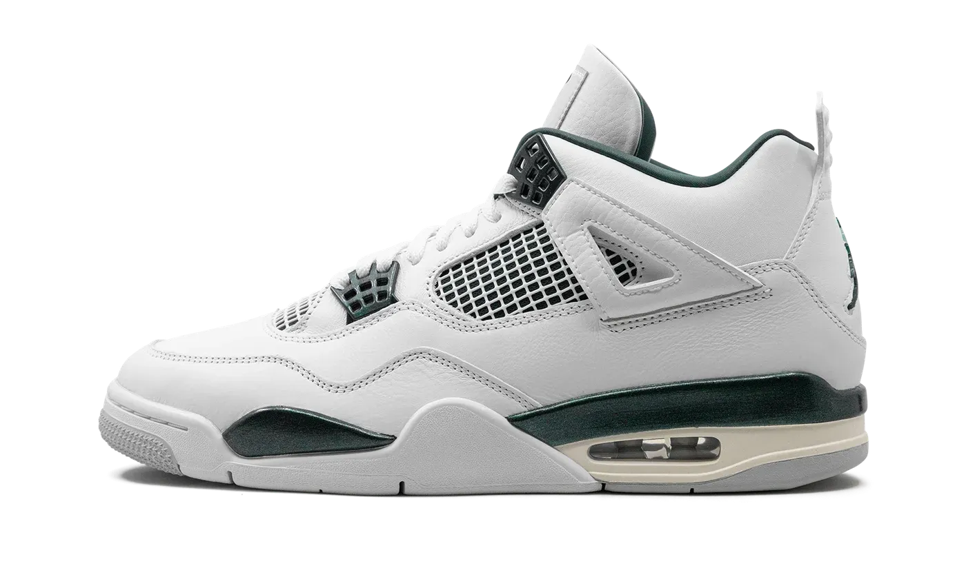 The Air Jordan 4 "Oxidized Green" is a colorway of Michael Jordan's fourth signature shoe with green details. A versatile look for the iconic silhouette, the upper features a white leather design with tonal netting on the mid-panel and tongue. Contrasting Oxidized Green accents can be found on the molded eyelets, the lace "wings," and on the heel tab, branded with a classic Jumpman logo. An additional Jumpman can be found on the tongue tag. Underfoot, an Oxidized Green mudguard, a vintage-inspired Sail midsole, and a visible Air unit in the heel complete the look. Release date: July 13, 2024