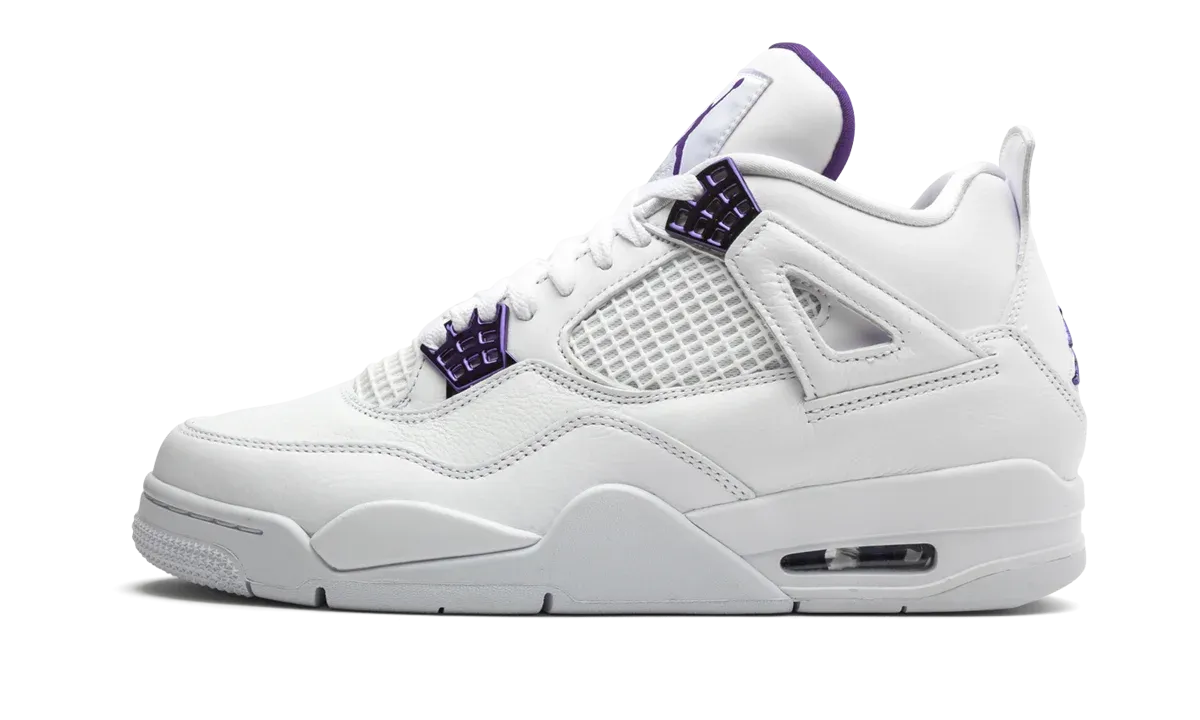 The Air Jordan 4 "Metallic Pack - Purple" one of four special edition colorways of the iconic model released for summer 2020. Inspired by the original "Metallic" colorways of the Air Jordan 1, the white and metallic-colored scheme is translated to four editions of the Air Jordan 4, including red, orange, green, and purple. Each colorway was released in specific regions of the world, with the US receiving this purple version. The construction features a full-grain leather upper with a metallic purple finish on the TPU lace eyelets and heel Jumpman logo. A matching purple hue is found on the inner lining, tongue logo, and visible Air unit. The "Metallic Purple" Air Jordan 4 released on May 20, 2020.