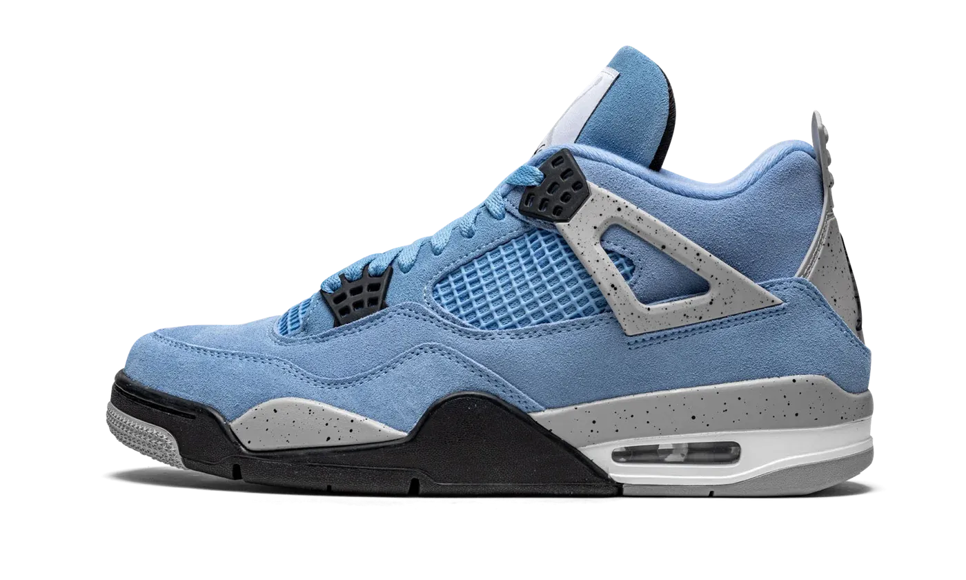 The Air Jordan 4 "UNC" is an April 2021 colorway of Michael Jordan's fourth signature shoe that honors Michael's alma mater, the University of North Carolina. The first-ever Jordan 4 in a "UNC" makeup, this collegiate design follows previous Air Jordans to employ the popular theme—the Air Jordan 3 "UNC" and the Women's Air Jordan 1 Mid "UNC" from 2020. Jordan Brand adds several athletic inspired touches to the look, including adding a "removable" name tag to the nylon Jumpman branding on the suede tongue in reference to the product tag on the bottom of basketball jerseys. The upper is constructed from supple University Blue suede, save for the tongue and mid-panel which feature tonal mesh detailing. Black plastic lace holders appear on the throat and collar and the plastic "Wings" tabs are given a decidedly "Cement" inspired look. The classic "Cement" detailing also appears on the back of the shoe with black Jumpman branding and on the mudguard. A small visible Air unit in the heel completes the look. Release date: April 28, 2021.