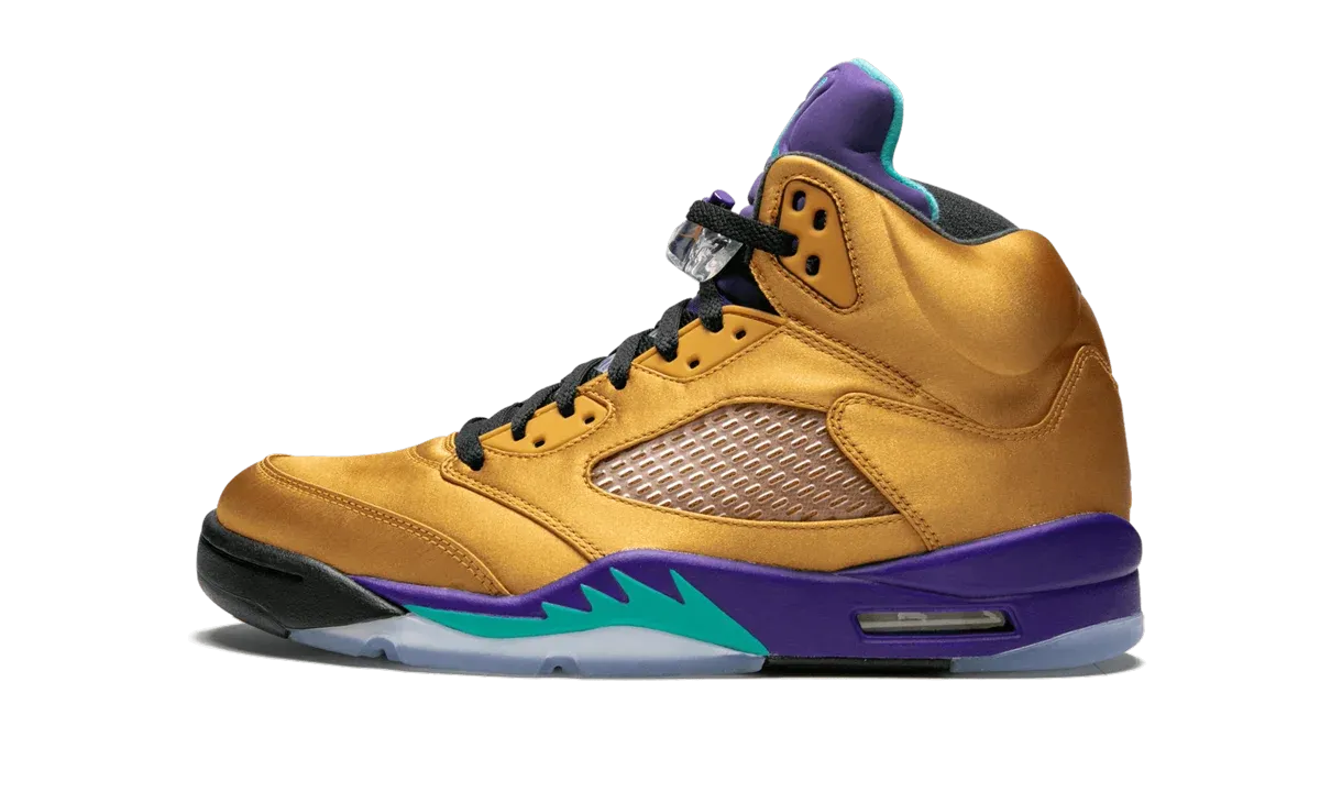 The Air Jordan 5 "Fresh Prince - Friends & Family" is an incredibly rare edition of the classic silhouette made only for Will Smith's inner circle. Produced in conjunction with the laceless retail version to honor Smith's 50th birthday, this version of the Jordan 5 features a more traditional construction with laces, but outfits the upper in shiny metallic gold satin. Other than the gold satin replacing the white leather, the rest of the "Grape" colorway is intact, except for a slight tweak of the red Jumpman logos on each heel. With only 25 pairs of the Air Jordan 5 "Fresh Prince - Friends & Family" rumored to exist, this is a true grail for Air Jordan collectors and fans of the iconic TV series.