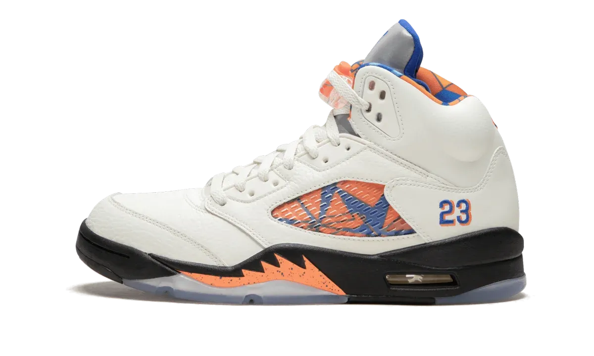 The Air Jordan 5 "International Flight" is inspired by Michael Jordan's status as basketball's greatest global ambassador. Along with "International Flight" editions of the Air Jordan 3 and Air Jordan 12, this unique Jordan 5 was released in 2018. This specific colorway is inspired by an exhibition game Jordan played in against the Spanish national team in Barcelona, Spain in 1990. Jordan wore a pair of the original Air Jordan 5 "Fire Red" with a blue, orange, and white uniform. The Air Jordan 5 "International Flight" takes the uniform colors and translates them across the silhouette, featuring a white leather upper with black, orange, and blue accents. A graphic print is also added to the inner lining and behind the clear mesh panels on the midfoot.