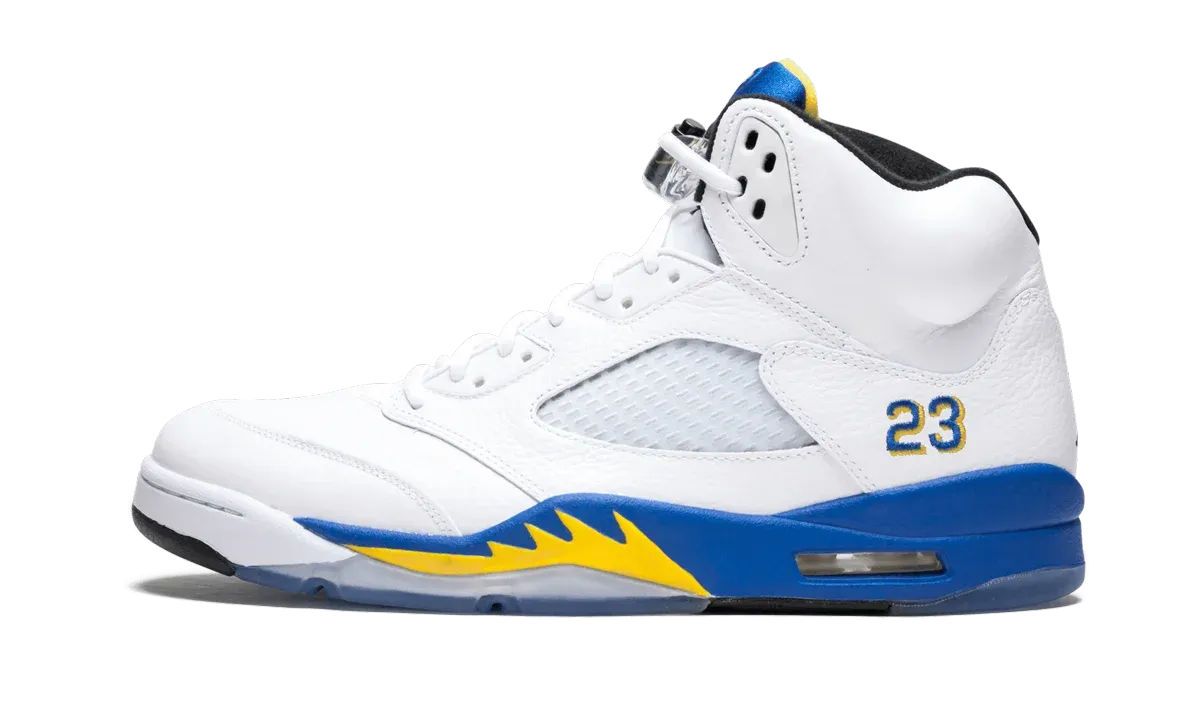 Supplied by a premier sneaker marketplace dealing with unworn, already sold out, in demand rarities. Each product is rigorously inspected by experienced experts guaranteeing authenticity. Based off the team colors of Michael Jordan's high school, this "Laney" Air Jordan 5 features a white leather upper with royal blue and yellow accents. First released in 2000 and then again in 2013, it has gone down as one of the all-time classic Air Jordan 5 colorways.