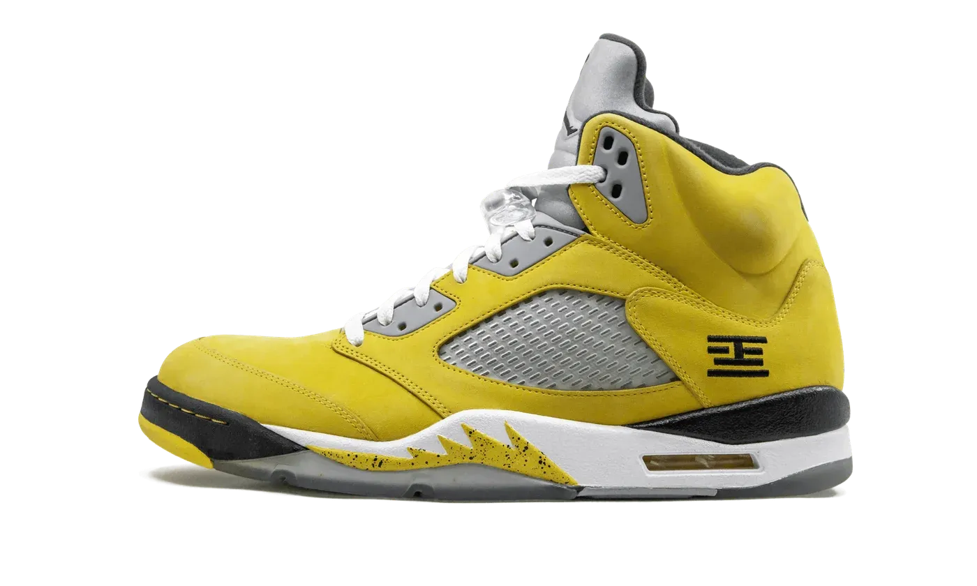 The Air Jordan 5 "T23" is a special release from 2011 for the Tokyo 23 basketball tournament in Japan. The eye-catching colorway features a yellow nubuck upper with black and white accents, resulting in one of the most distinct looks for the shoe ever. The rare colorway released in very limited numbers only in Japan.