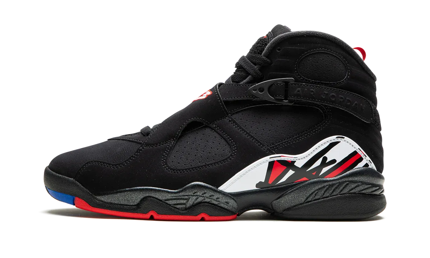 The Air Jordan 8 "Playoffs 2023" is the modern re-release of an original colorway of Michael Jordan's eighth signature shoe that was worn by Jordan with the Chicago Bulls during the 1993 NBA Playoffs. The Jordan 8 "Playoffs" is a classic and beloved colorway of the vintage basketball shoe and, on this 2023 iteration of the design, it features all the same details that made the original version a legendary sneaker back in the day. The shoe is complete with a black synthetic nubuck upper with supportive cross straps. Red pull tabs on the heel are a nod to the original color of the design on the '93 release. Jumpman branding appears on the model's signature chenille Jumpman patch and a brushstroke-like graphic is found on the mudguard. Release date: September 30, 2023