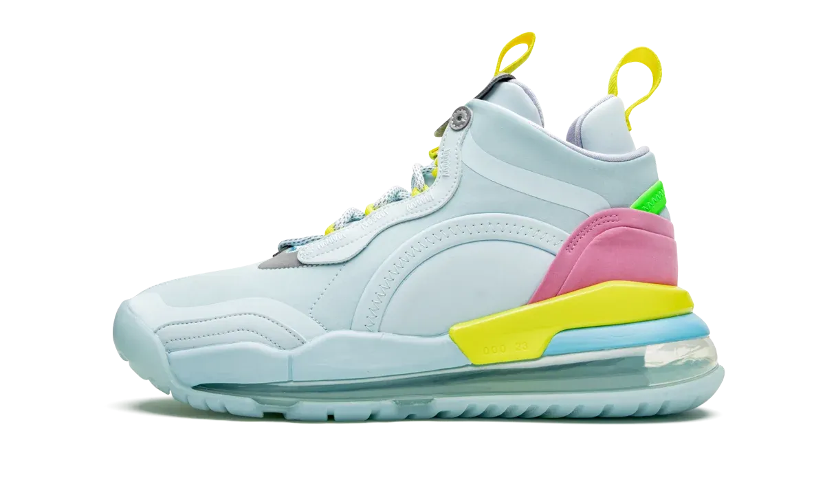 The Cole Bennett Lyrical Lemonade x Nike Jordan Aerospace 720 brings music video director and Lyrical Lemonade founder Cole Bennet's ideas to life on a footwear classic. With a design inspired by Bennett's motto "Global Now, Chicago Forever," the upper's icy blue tone represents the stripes on Chicago's flag while accents of purple, green, and yellow add a pop of color to the suede overlay and TPU molding found on the heel. Similar pastel shades also make an appearance on the different Lyrical Lemonade cartoon logos featured on each tongue. The translucent blue midsole includes signature Air cushioning and an insole that displays Lyrical Lemonade graphics.