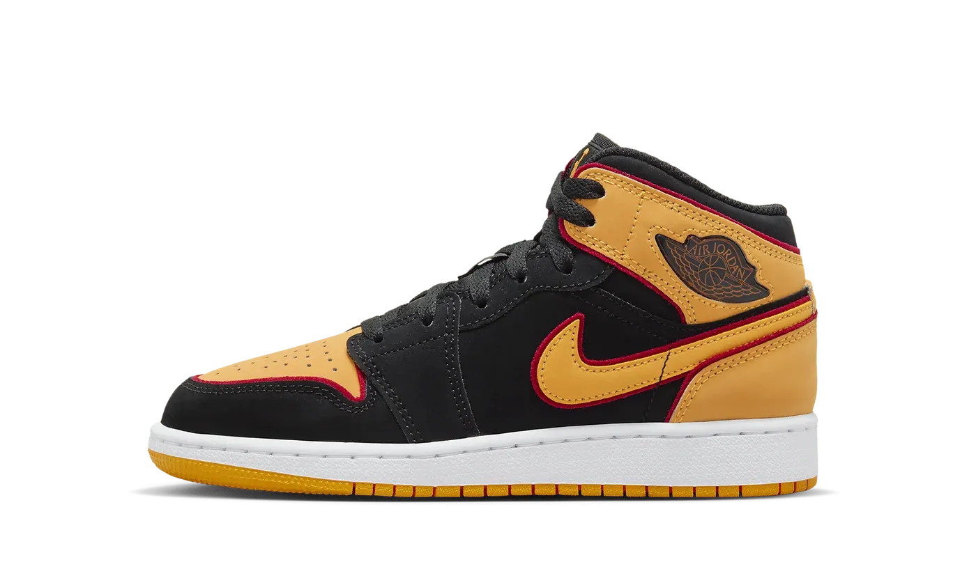 The Air Jordan 1 Mid GS "Vivid Orange" is the youth sizing of the colorway of the mid-top sneaker with orange and red accents. The "Vivid Orange" Jordan 1 Mid is complete with a black synthetic nubuck base with tonal overlays on the toe, forefoot, and eyelets. Vivid Orange accenting is seen on the perforated leather toe, collar, heel, and Swoosh. The orange panels are outlined with red. The blazing shade of orange can also be found on the Jumpman logo on the tongue. A white rubber midsole and orange outsole complete the look. Release date: August 31, 2023