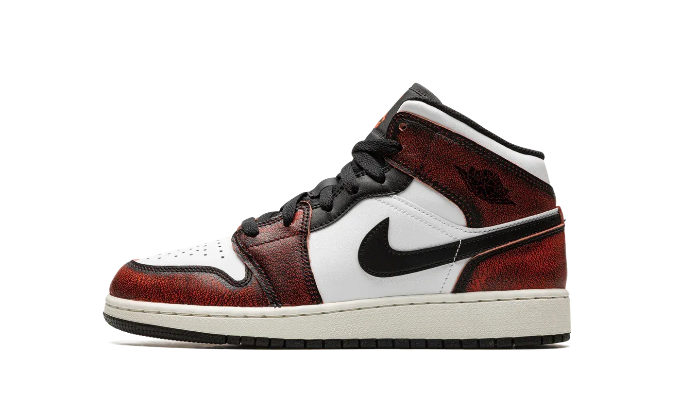 The Air Jordan 1 Mid SE GS "Wear-Away Infrared" is the youth sizing of the Chicago Bulls-inspired colorway of the mid-top lifestyle shoe with unique design elements. The "Wear-Away Infrared" has a white leather base with contrasting black leather Swoosh on the sides. The overlay panels feature an Infrared-colored base with a black coating designed to wear away with use—in fact it already comes with a pre-worn treatment. The red hue under the black accenting becomes more apparent as the textile erodes. A black "Wings" logo can be found on the collar, and red Jumpman and "Air" logos appear on the tongue tag. Release date: September 14, 2022
