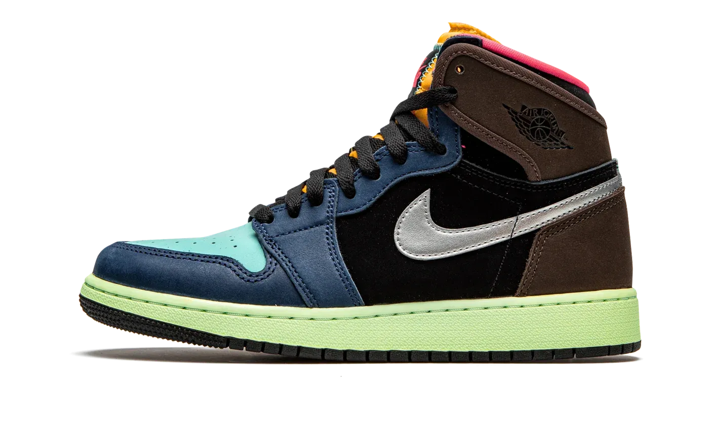 The Air Jordan 1 High GS "Bio Hack" is the youth sizing of Michael Jordan's first signature shoe in a bold yet somewhat familiar colorway. Loosely based on Undefeated's classic Nike Dunk collaboration from 2005, the "Bio Hack" pulls various contrasting colors together to form one of the boldest Jordan 1s yet. The Baroque Brown collar and heel is reminiscent of Travis Scott's Air Jordan 1. A Metallic Silver leather Swoosh appears on the black nubuck mid-panel. The perforated toe is finished off in teal suede. Final design elements include a Laser Orange tongue, tonal laces, and a mint green rubber outsole. Release date: September 4, 2020.