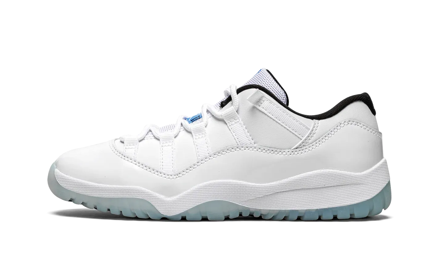 The Jordan 11 Low PS "Legend Blue" is the preschool sizing of the colorway based on an original version of Michael Jordan's eleventh signature shoe. The Air Jordan 11 "Columbia" was released by Nike in 1996 and worn by Michael during the 1996 NBA All-Star Game. Without any official naming by Nike or Jordan, the "Columbia" undoubtedly saluted Michael's alma mater, the North Carolina Tar Heels. In 2014, the "Columbia" was repackaged as the "Legend Blue" and was converted to a low-top on this 2021 release. The "Legend Blue" shares many similarities with the original look. A crisp white leather upper and white patent leather mudguard is on par with the "Columbia." A white mesh tongue with Legend Blue "Jumpman Jordan" branding contrasts the black inner lining. A small blue Jumpman appears on the heel. An icy blue semi-translucent outsole completes the look. Release date: May 7, 2021.