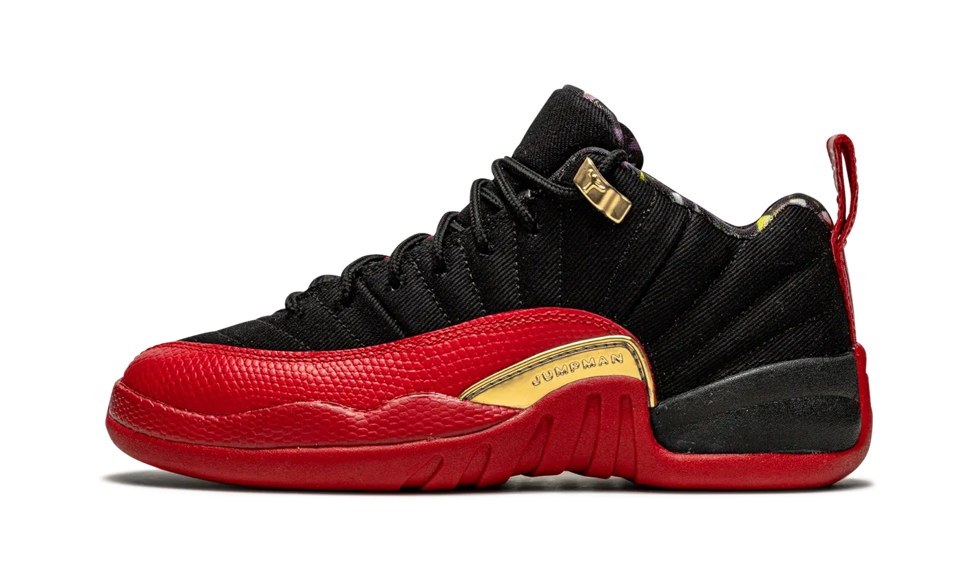 The Air Jordan 12 Low GS "Super Bowl LV" is the youth sizing of Michael Jordan's twelfth signature shoe in a colorway dedicated to the NFL's ultimate game. Released by Jordan Brand in February 2021 prior to Super Bowl LV (55), this low-top Jordan 12 features various football references in its design, beginning with the Vince Lombardi Trophy inspired gold accenting on the mid-panel and confetti-style pattern on the liner. The rest of the design is reminiscent of the iconic "Flu Game" colorway worn by Michael during the '97 NBA Finals. A Varsity Red textured leather overlay appears on the forefoot and a black canvas material forms the base of the shoe. Black Jumpman embroidery can be found above the red "Two 3" branding on the middle of the tongue. While the aforementioned designs tie in with the team uniform colors of the Chicago Bulls, the "ribbon" style design on the heel is a reference to the old team uniform colors of the Tampa Bay Buccaneers, one of the two teams in Super Bowl LV, and the host city of the event, as well. Release date: February 6, 2021.