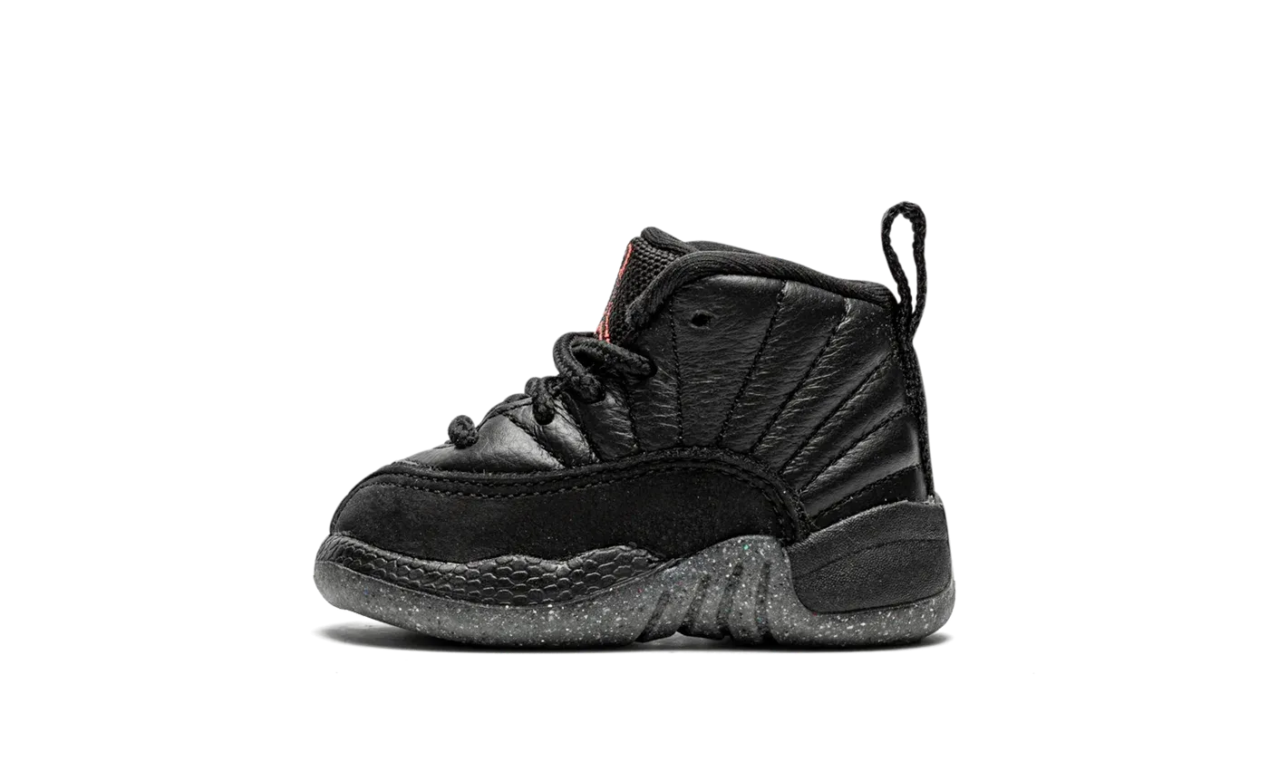 The Jordan 12 TD "Utility" is the toddler sizing of Michael Jordan's twelfth signature shoe in a colorway that features Nike's sustainable "Grind" material in its sole. The "Utility" represents one of the latest design advancements of the vintage basketball shoe that once introduced Nike's Zoom Air cushioning technology into the Air Jordan line in 1997. A black tumbled leather upper is paired with a black synthetic nubuck mudguard. Red piping borders the "Jumpman" branding on the lateral side. The tongue appears in a rugged ballistic mesh textile. Other details include a black midsole with a faux lizard skin finish and an outsole constructed from Nike's "Grind" composition, which contains up to 3% recycled materials. Release date: August 21, 2021