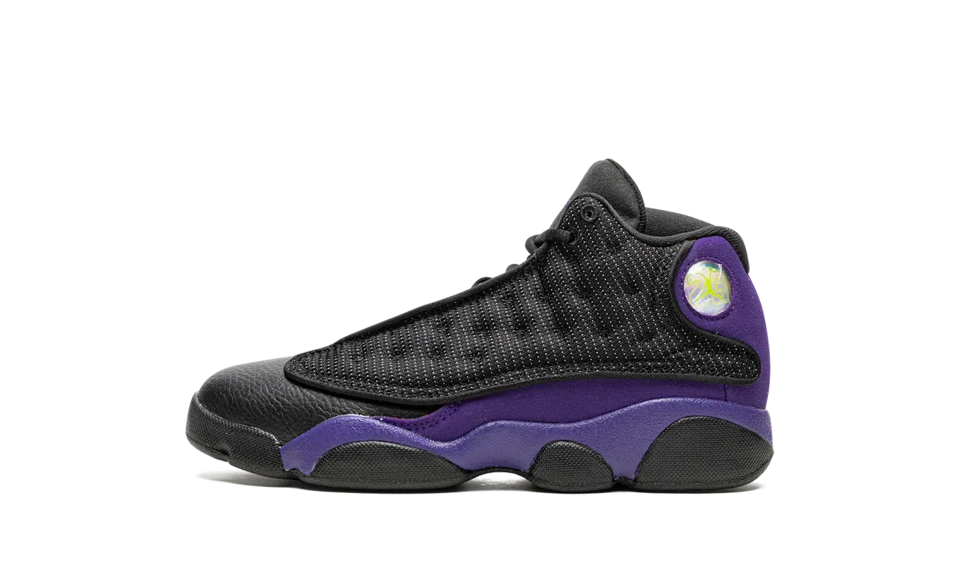 The Air Jordan 13 PS "Court Purple" is the preschool kids sizing of Michael Jordan's thirteen signature shoe in a colorway that shows love to the the Los Angeles Lakers. Released in January 2022, the "Court Purple" is yet another Jordan 13 in a colorway inspired by the Lakers—the first being the aptly named "Lakers" makeup that was released in July 2019. Without any official Lakers branding, the "Court Purple" nonetheless features the Lakers' color palette on its design. The "Court Purple" mimics the color block of the Jordan 13's original "Bred" colorway by substituting the red accenting for purple along the heel and mudguard. The black mesh upper is treated to a reflective finish. A holographic emblem denoting Jordan's "Black Cat" nickname, meant to resemble a panther's eye, can be found on the heel. Black midsole walls complete the look. Release date: January 8, 2022