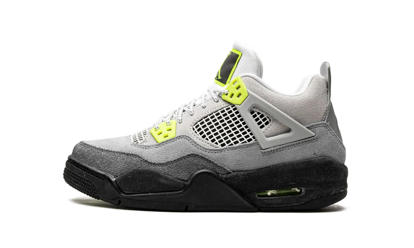 The Air Jordan 4 GS "Neon" is the youth sizing of the design that draws favorably from another legendary sneaker in Nike's catalog: the Air Max 95 "Neon." The upper features a light-to-dark grey suede composition that is finished off with a dark grey mudguard. Like the beloved '90s runner, the shoe seen here is outfitted with vibrant neon accenting that appears on the clips that support the lacing system. The speckled rope laces mirror what you would find on the Air Max 95 "Neon." A split Jumpman-branded tongue tab and Nike Air branding on the heel are two of the most easily recognizable forms of branding within sneaker culture.
