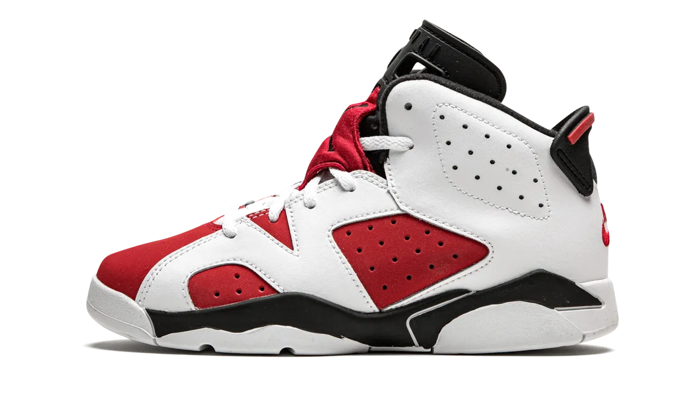 The Air Jordan 6 PS "Carmine" is the preschool sizing of an original colorway of Michael Jordan's sixth signature shoe that was remastered in February 2021. The return to the "OG" styling coincides with the Jordan 6's 30th anniversary celebration in 2021. The design features white leather overlays on the forefoot, mid-panel, and eyelets above the red synthetic nubuck base, which appears in a darker shade of Carmine that's accurate to the original. Perforations on either side of the shoe and collar and consistent with the original styling of the Air Jordan 6. Similarly, the black liner and neoprene lace shroud with black Jumpman branding are accurate to the OG "Carmine." Release date: February 13, 2021.