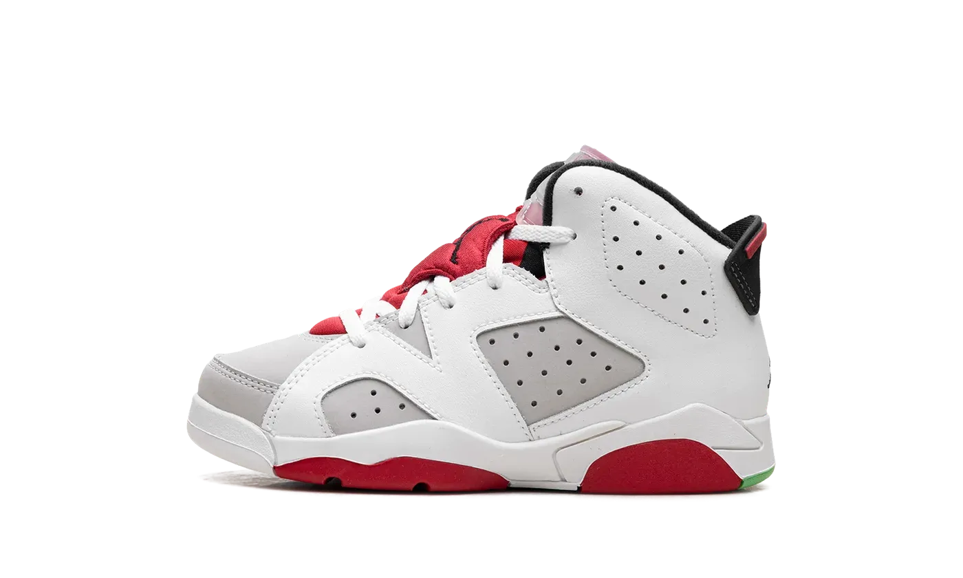 The Air Jordan 6 PS "Hare" shrinks Michael Jordan's sixth signature shoe in size to fit the feet of preschoolers while paying homage to a legendary colorway in the Jordan Brand collection: the original Air Jordan 7 "Hare." Debuted by both Jordan and Bugs Bunny during a run of early '90s commercials, the "Hare" design returns in Spring 2020 with noticeable differences that still honor the legacy of the beloved look. The upper features a light grey perforated synthetic nubuck base that is visible on the forefoot and mid-panel. Stark white leather overlays add a touch of contrasting along the forefoot, mid-panel, and heel. Additional design elements include a black rubber spoiler with red accenting on the heel and a red neoprene tongue with black Jumpman branding. Release date: June 12, 2020.