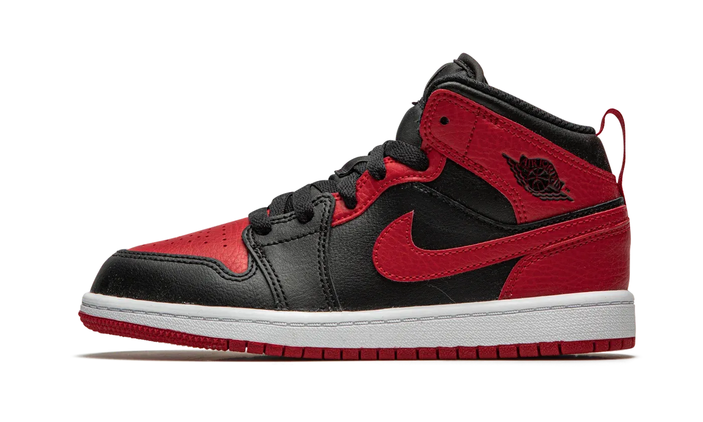 The Air Jordan 1 Mid PS "Banned 2020" is the preschool sizing of Michael Jordan's first signature shoe in a colorway inspired by the Nike Air Ship design of the same nickname. Worn by Michael early in his career with the Chicago Bulls, the Air Ship "Bred" or "Banned" was in fact outlawed by the NBA's league offices because it violated a since-removed team uniform policy that a player's shoe had to be at least 50% white. Similarly to the Air Ship, this "Banned" Jordan 1 Mid features a black and red color scheme that jives with the Bulls' team uniforms. Red leather can be found on the perforated toe, collar, heel, and Swoosh branding on the mid-panel. The fiery shade of red also appears on the middle eyelet panel and heel tab on the back of the shoe. Contrasting black leather can be found on the toe cap, forefoot, and mid-panel. Jordan Brand outfits the tongue in lightweight black nylon and places a black "Wings" logo on the collar.