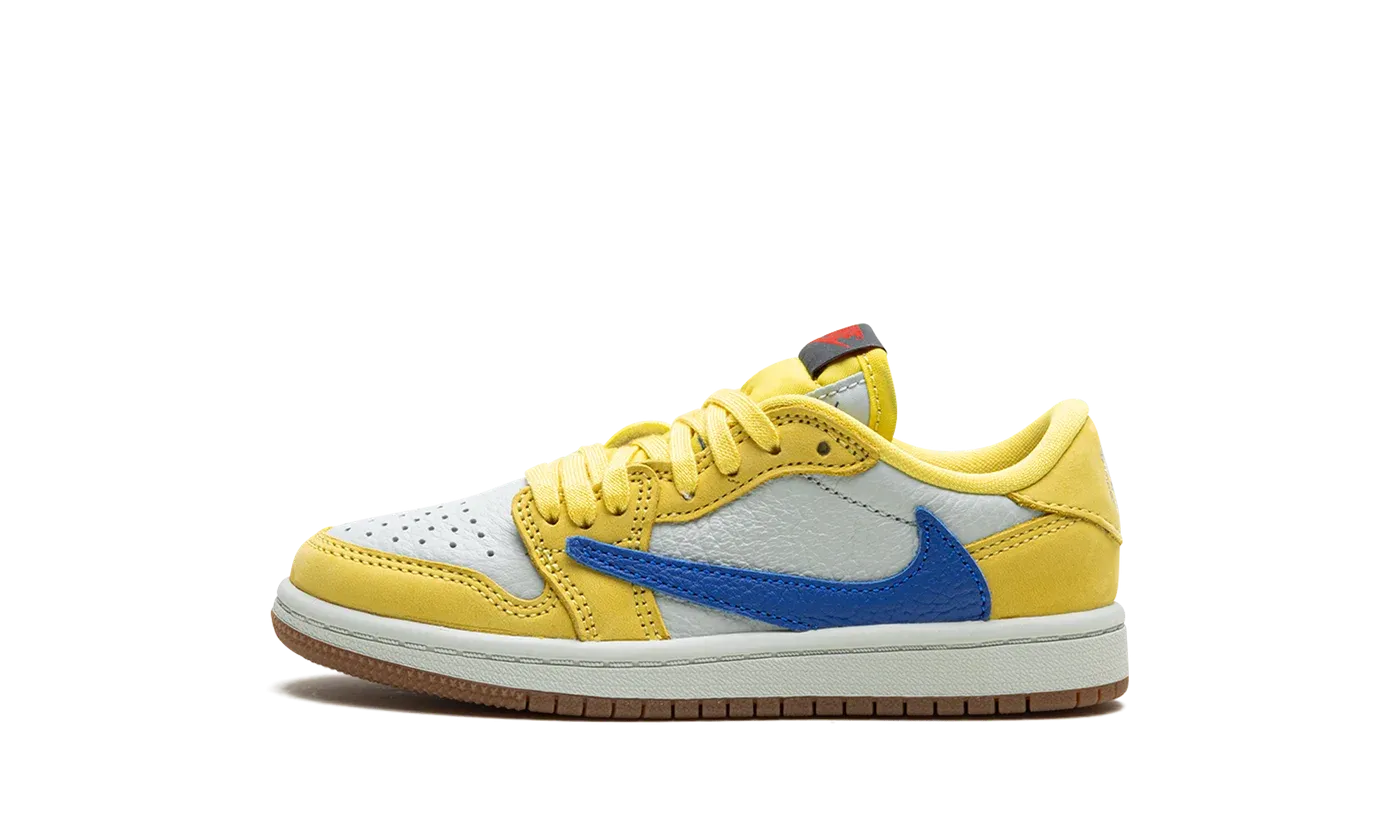 The Travis Scott x Air Jordan 1 Low OG PS "Canary" is the preschool sizing version of the retro basketball shoe inspired by the hip-hop star's high school. Also known as the "Elkins" after Scott's high school, the "Canary" Jordan 1 Low OG features bold, creative details such as the rapper's signature reverse Swoosh and "Cactus Jack" branding. Specifically, the upper has a white leather base with Canary leather overlays on the forefoot and heel. A reverse Racer Blue leather Swoosh can be found on the lateral side and a standard blue leather Swoosh appears on the medial side. Scott's "smiley face" logo is embroidered on the left heel tab and a "Wings" logo is embroidered on the right heel tab. Classic red "Nike Air" branding appears on the black tongue tag. A gum rubber outsole completes the look. Release date: May 25, 2024