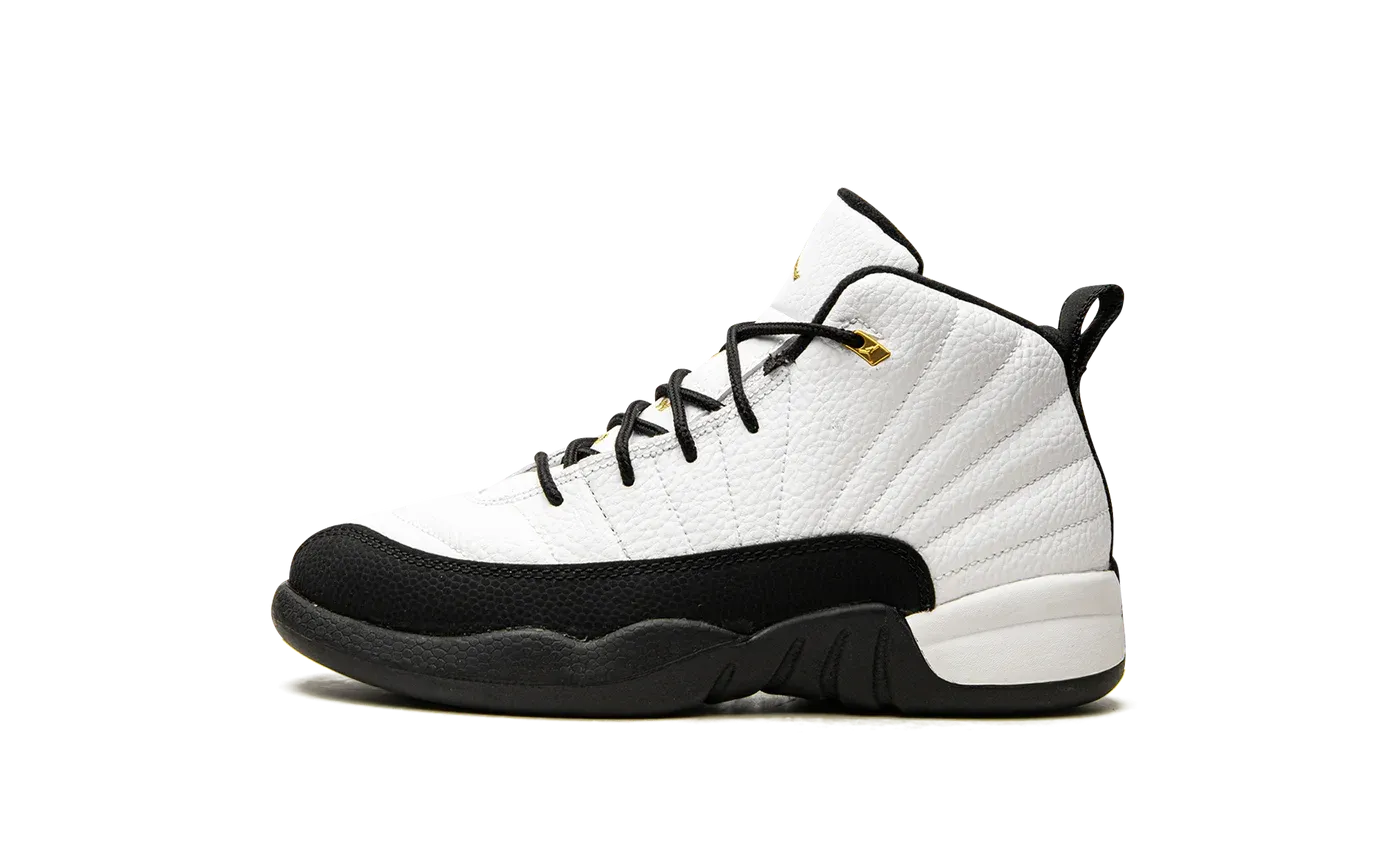 The Jordan 12 Retro "Royalty" is the Preschool kids sizing of the clean black, white, and gold colorway. A reimagined version that mimics the Air Jordan 12's original white-and-black "Taxi" colorway from the late '90s, this style comes with a few modifications. The Jumpman plate above the midsole is done in gold, and additional gold accenting appears on the Jumpman-branded eyelet holders and Jumpman and "Two 3" detailing on the white leather tongue. A black rubber sole grounds the preschool Jordan sneaker.