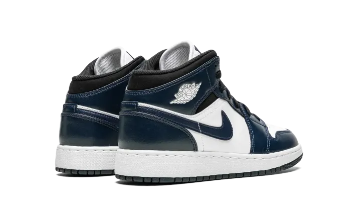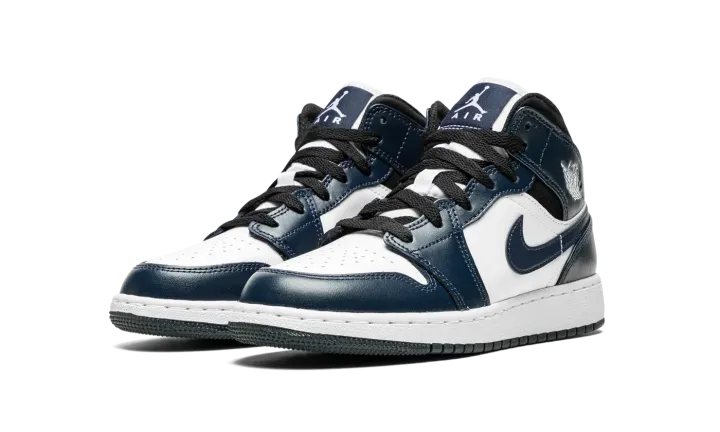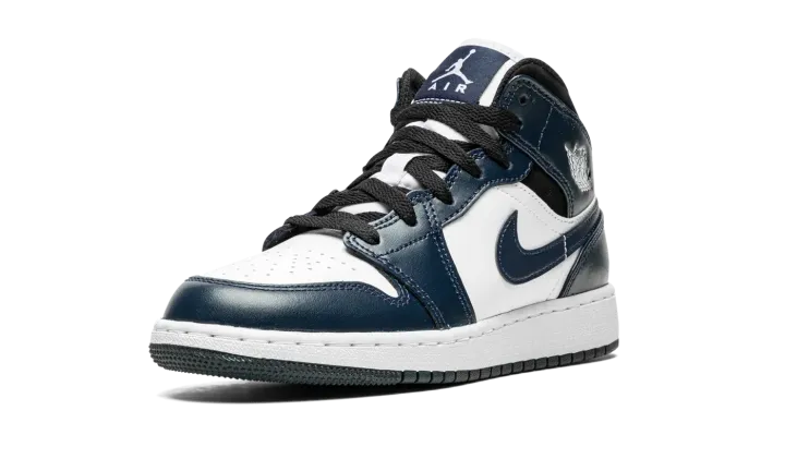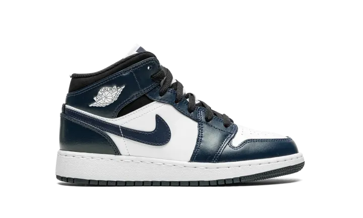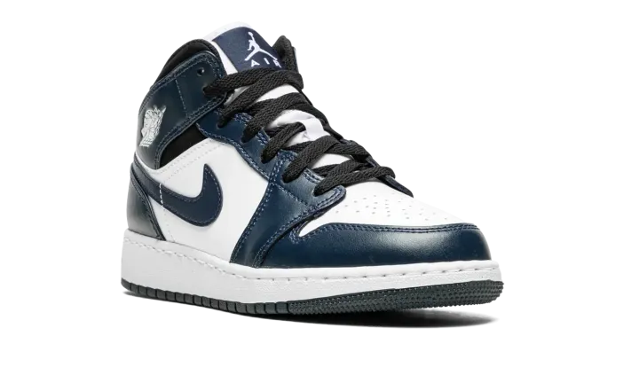 The Air Jordan 1 Mid GS "Armory Navy" is the youth sizing of the casual lifestyle shoe in a predominately two-tone, white-and-navy color block. As wearable as any Air Jordan 1 Mid for kids—or adults, for that matter—the "Armory Navy" displays white leather on its perforated toe and mid-panel. The toe cap, forefoot, eyelets, collar, heel, and Swoosh are designed in slightly shiny Armory Navy-colored leather. A classic "Wings" logo is found on the collar and a white Jumpman with "Air" branding appears on the Armory Navy nylon tongue tag on the white nylon tongue.