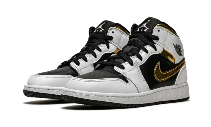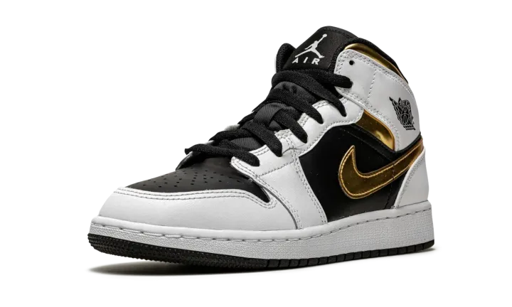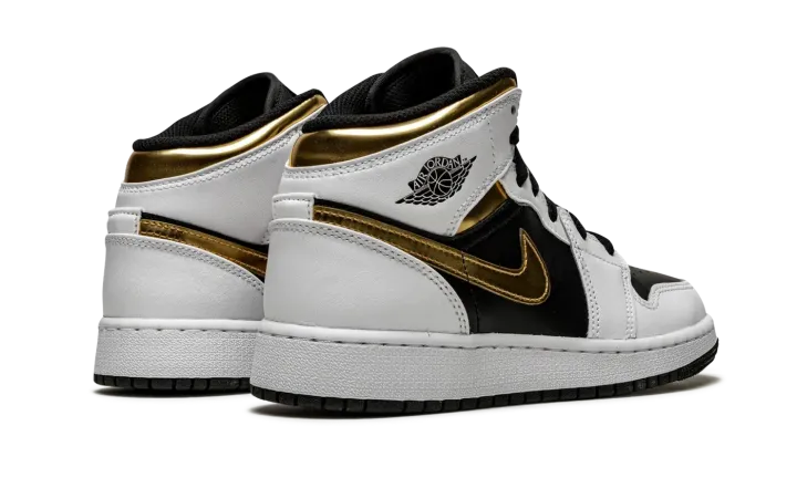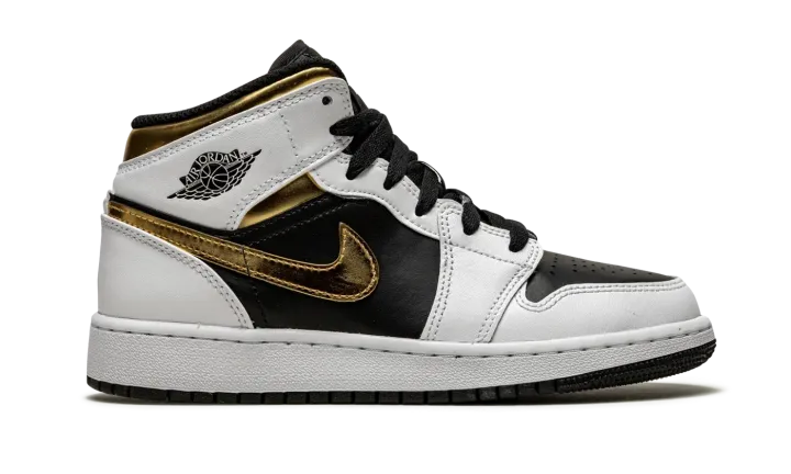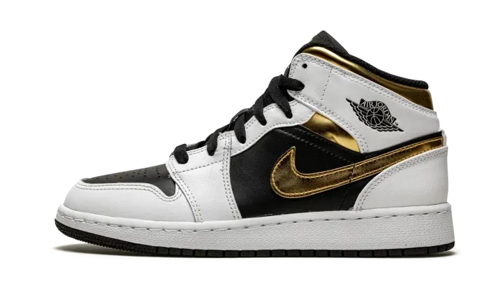 The Air Jordan 1 Mid GS "White/Gold/Black'' is a premium look for Michael Jordan's first signature shoe in youth sizing. Over the last few years, the Jordan 1 Mid has become an increasingly popular shoe in Michael Jordan's signature footwear line, especially in kids sizing. It's easy to see why that's so on this upscale rendition of the shoe. Metallic Gold leather appears on the Swoosh and on the collar. Contrasting white leather overlays can be found on the forefoot, eyelets, collar, and heel. Black leather forms the base of the shoe. A black "Wings" logo appears on the collar and a white Jumpman insignia compliments the branding tag found on the black nylon tongue. A black liner, white midsole, and black outsole round out the look of yet another appealing colorway of the Air Jordan 1 Mid for kids.