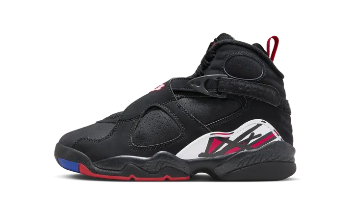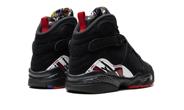 The Air Jordan 8 "Playoffs 2023" is the youth sizing for the 2023 re-release of an original colorway of the basketball shoe that was worn by Michael Jordan during the 1993 NBA Playoffs. The Jordan 8 "Playoffs" is a classic and beloved look for Jordan's eighth signature model in his Chicago Bulls team colors. On this 2023 iteration of the design, it features all the same details that made the original version a legendary sneaker. The "Playoffs" Jordan 8 features a black synthetic nubuck upper with supportive cross straps. Red pull tabs on the heel are a nod to the original color of the design on the '93 release. Jumpman branding appears on the model's signature chenille Jumpman patch and a brushstroke-like graphic is found on the mudguard. Release date: September 30, 2023