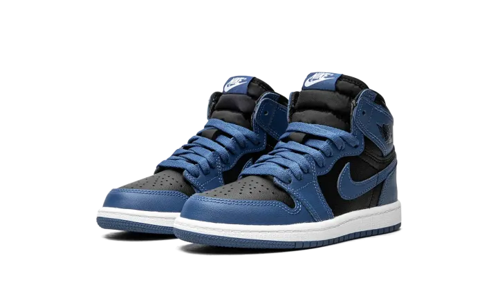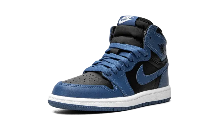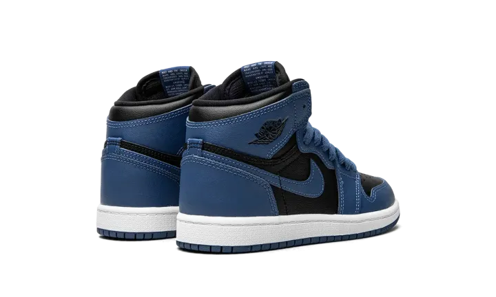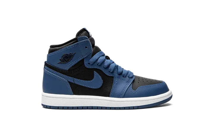 The Air Jordan 1 High OG PS "Dark Marina Blue" is the preschool sizing of Michael Jordan's first signature shoe in a colorway that mimics the appearance of an original, iconic Jordan 1 style. The shoe we're referring to is the Air Jordan 1 "Royal" in black and royal blue, which was originally released by Nike back in 1985. The "Dark Marina Blue" appears in a similar blue hue, and with a slightly altered color block in comparison to the original "Royal." The black leather base contrasts the Dark Marina Blue leather overlays and Swoosh branding. A black "Wings" logo is found on the collar. Classic "Nike" and Swoosh branding appear in white on the tongue tag. Release date: January 15, 2022 (Europe) / February 16, 2022 (USA)