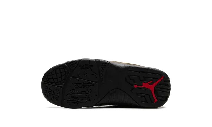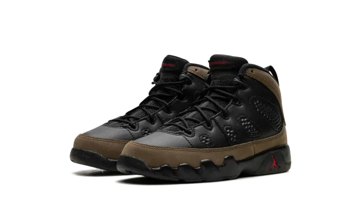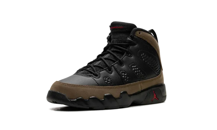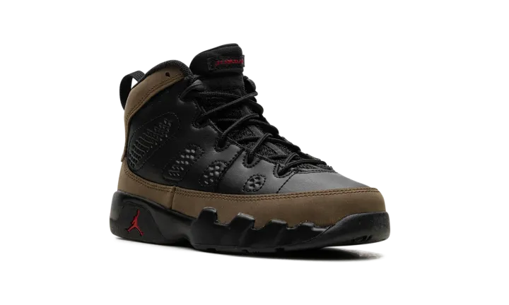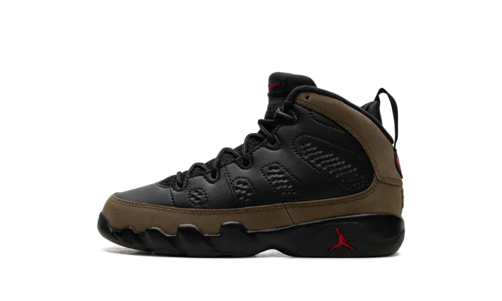 The Air Jordan 9 PS "Olive 2024" is the preschool sizing of the 2024 reissue of an original colorway of Michael Jordan's ninth signature shoe. The Jordan 9 "Olive" was designed by legendary Nike shoe designer Tinker Hatfield and released in 1994. It is regarded as one of the most popular colorways of the Jordan 9. On the 2024 re-release, Jordan Brand brings back the shoe's original styling, much to the delight of sneaker collectors. The upper features a black leather construction with Light Olive suede on the mudguard, collar, and heel. Varsity Red "Air Jordan" branding appears on the tongue, and a Varsity Red Jumpman can be found on the lateral side of the black midsole. Additional Varsity Red detailing appears in the form of a "globe" on the heel, and an oversized Jumpman on the black rubber outsole. Release date: October 25, 2024