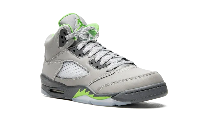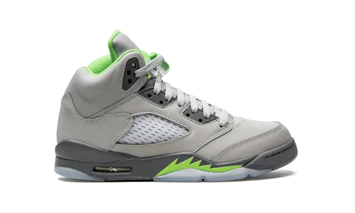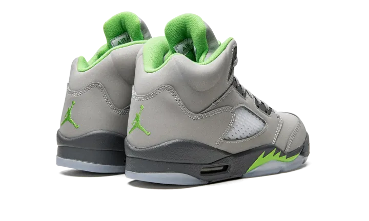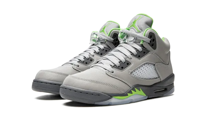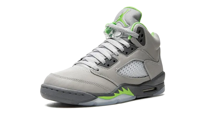 The Air Jordan 5 GS "Green Bean" is the youth sizing of the colorway of the retro basketball shoe with a reflective finish that was first released in 2006. This May 2022 version of the Jordan 5 GS "Green Bean" is nearly identical to the original version of the sneaker from '06. The shoe's grey synthetic upper is treated with a reflective finish that is supposedly inspired by the original sketch of the Jordan 5 by Tinker Hatfield. According to Nike, Hatfield originally designed the Air Jordan 5 with a fully reflective upper, but ultimately scrapped the idea prior to the shoe's production in 1990. As for the rest of the modern "Green Bean's" design, bright green accents appear on the interior lining, on the sharktooth detailing on the midsole, and on the embroidered Jumpman on the silver reflective tongue and on the heel. The shoe features translucent mesh on the sides and on the lower tongue. Release date: May 28, 2022