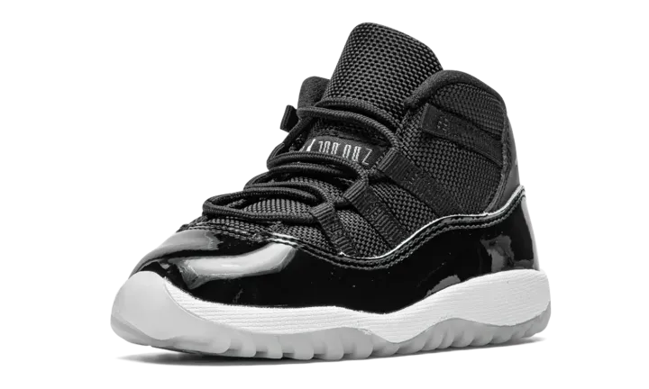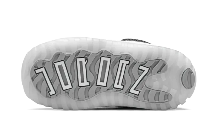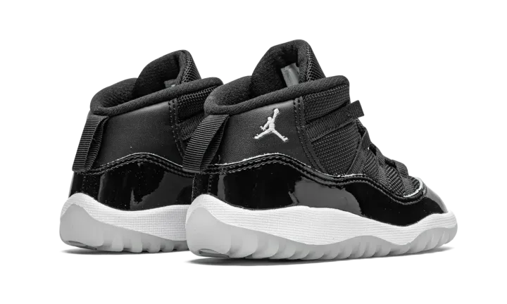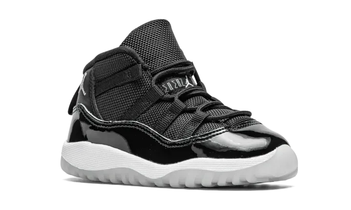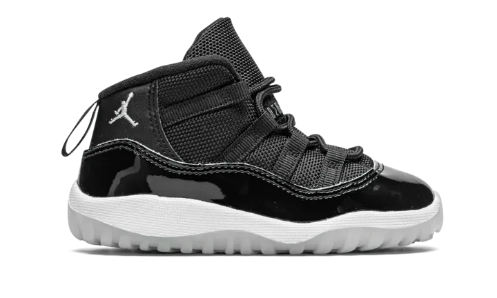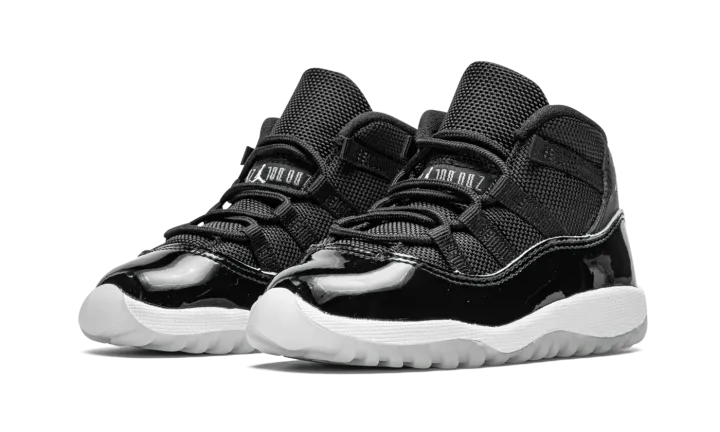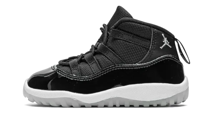 The Air Jordan 11 TD "Jubilee" is the toddler sizing of Michael Jordan's eleventh signature shoe in a special 25-year anniversary colorway. The "Jubilee" is influenced by an original sketch of the Jordan 11 by Tinker Hatfield from the '90s. The "Jubilee" also borrows from the "Concord," "Space Jam," and "Bred" colorways by employing a black patent leather mudguard above the white midsole. A special metallic silver treatment is given to the Jumpman emblem on the collar. Release date: December 12, 2020.