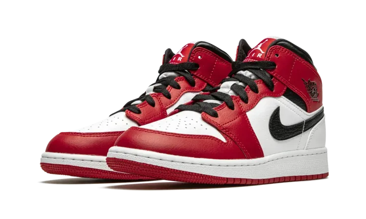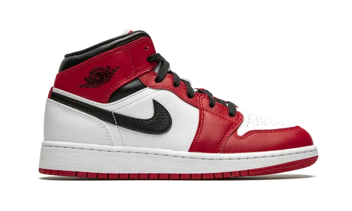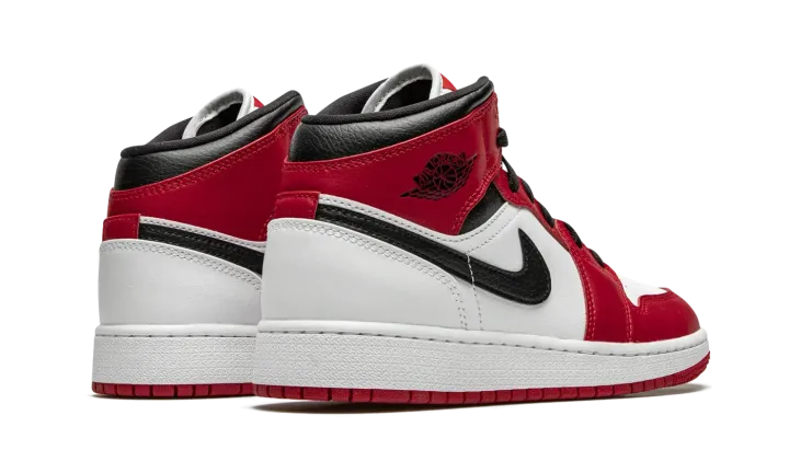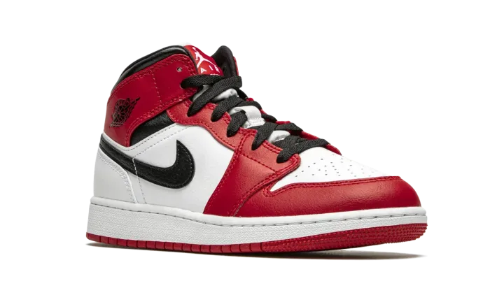 The Air Jordan 1 Mid GS "Chicago 2020" is the youth sizing of the mid-top version of Michael Jordan's timeless first signature shoe. The "Chicago" colorway of the Jordan 1 is sighted as one of the greatest designs in sneaker history, and desired by many in the uncommonly seen mid-top cut. White leather appears on the perforated toe, mid-panel, and heel. Contrasting red leather overlays cover the forefoot, eyelets, and collar. Appearing just as they did on the original version of the Air Jordan 1 High "Chicago" in 1985, black Wings detailing and black Swoosh branding grace the collar and mid-panel, respectively. A white leather tongue, black cotton laces, and white Jumpman detailing on the blazing red nylon tongue finish off what is surely one of the most coveted shoes for grade schoolers on the market today.