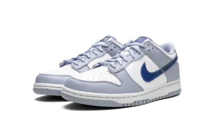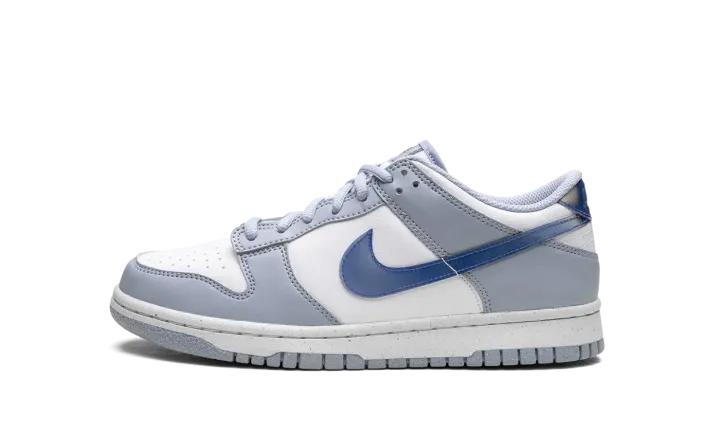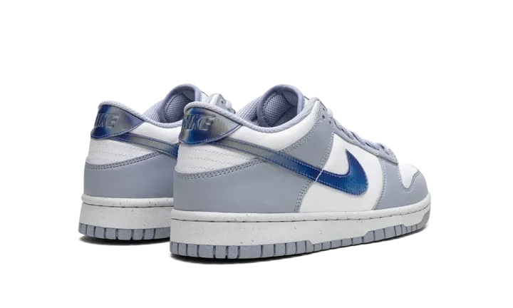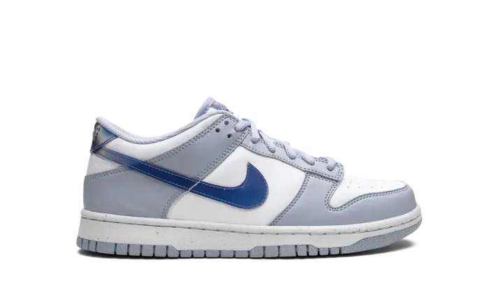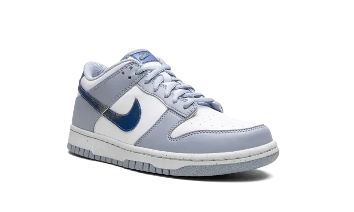 The Nike Dunk Low GS "Blue Iridescent" is the youth sizing of the classic sneaker with a unique-looking Swoosh. The "Blue Iridescent" Dunk Low features a white leather construction with light blue leather overlays. On the sides, a Blue Iridescent Swoosh logo adds intrigue to the shoe's design. More iridescent accents land on the heel and on the tongue. The shoe rides on a white rubber midsole and light blue rubber outsole. Release date: April 1, 2023