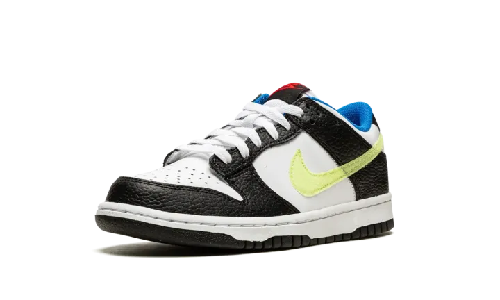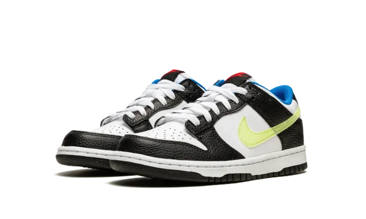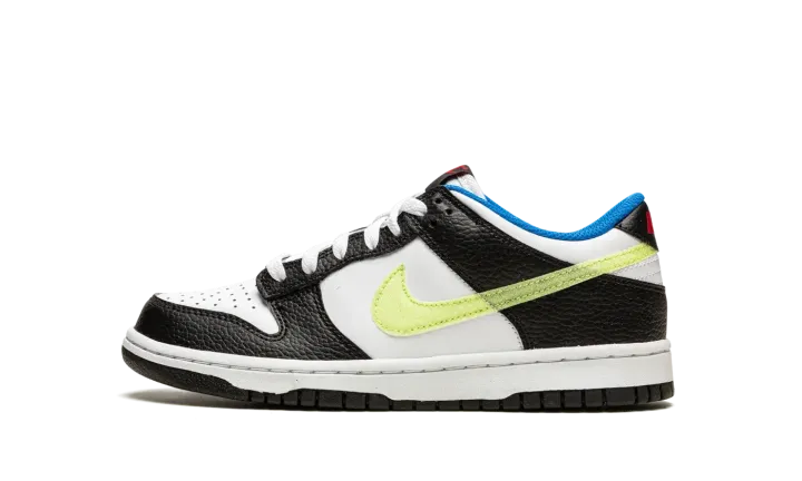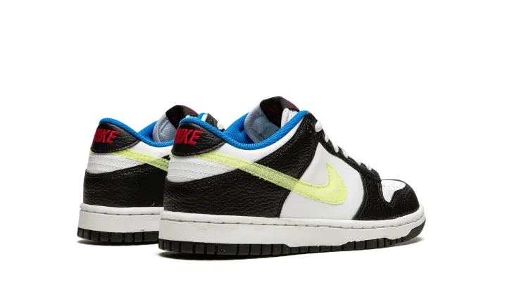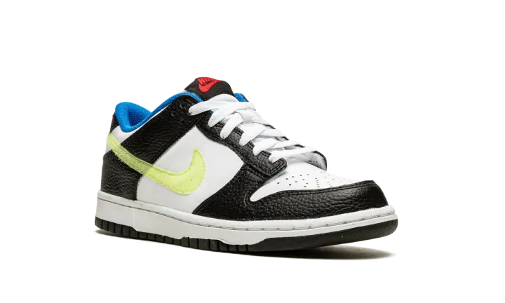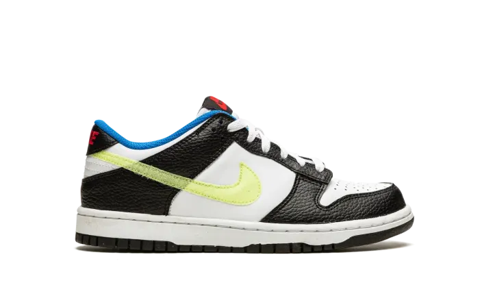 The Nike Dunk Low GS "Signal Blue/Lemon Twist" is for kids who have a flair for street fashion. Black leather overlays can be found on the forefoot, eyelets, collar, and heel of this coveted Nike style. Red accenting can be found on the "Nike Air" branded nylon tongue tag. Giving the shoe some extra spice are the translucent yellow Swoosh branding on the mid-panel and royal blue collar lining. Finishing touches include a white mesh tongue, white rubber midsole, and black outsole.