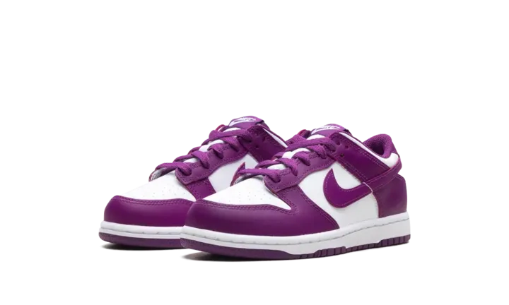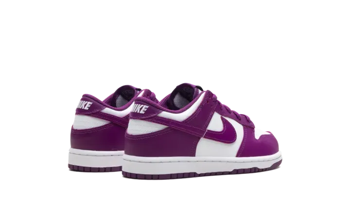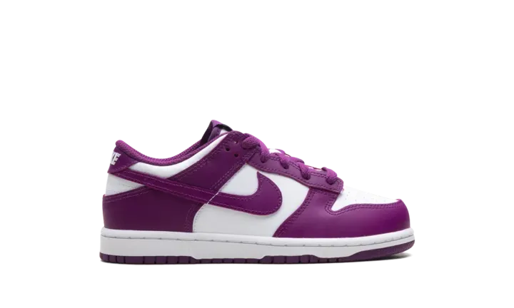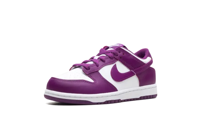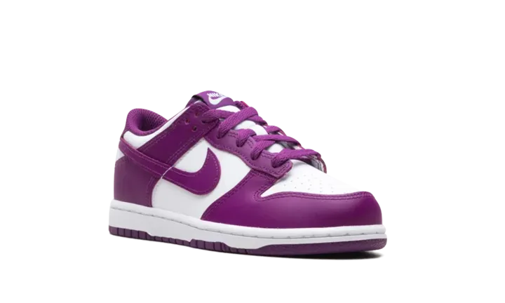 the Nike Dunk Low in the "White/Viotech-White" colorway, designed for Little Kids or Preschoolers (PS). This classic basketball-inspired sneaker features a premium leather upper, a soft foam midsole for cushioning, a padded collar for comfort, and a durable rubber outsole with pivot-point tread for excellent grip.