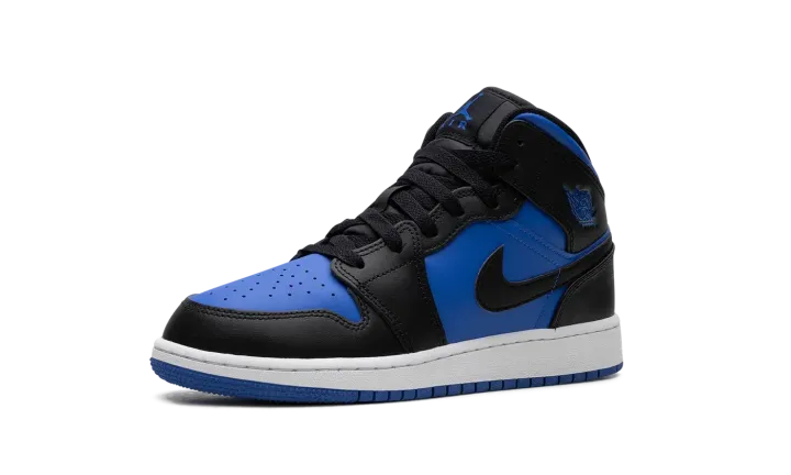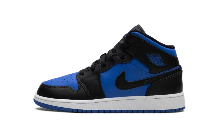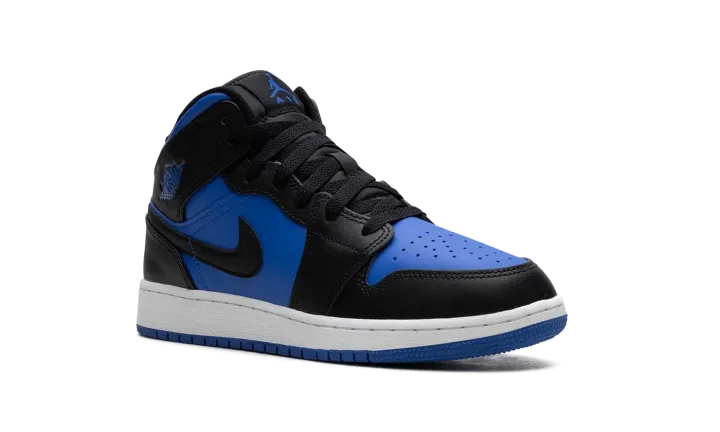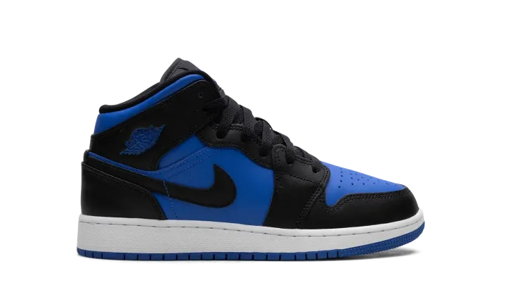 The Air Jordan 1 Mid GS "Varsity Royal" is the youth sizing of the colorway of the lifestyle sneaker with a classic appearance. Inspired loosely by the Air Jordan 1's original "Royal" colorway, the "Varsity Royal" Jordan 1 Mid features royal blue leather on the perforated toe, mid-panel, and collar. Contrasting black leather overlays and a black leather Swoosh balance the look. A Varsity Royal "Wings" logo can be seen on the collar while a Varsity Blue Jumpman is found on the tongue tag. A white midsole and blue outsole complete the look. Release date: September 19, 2023