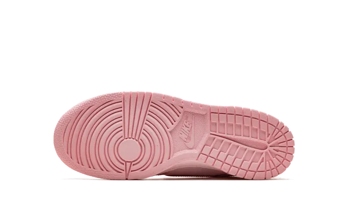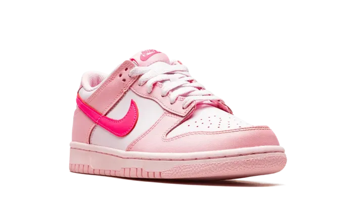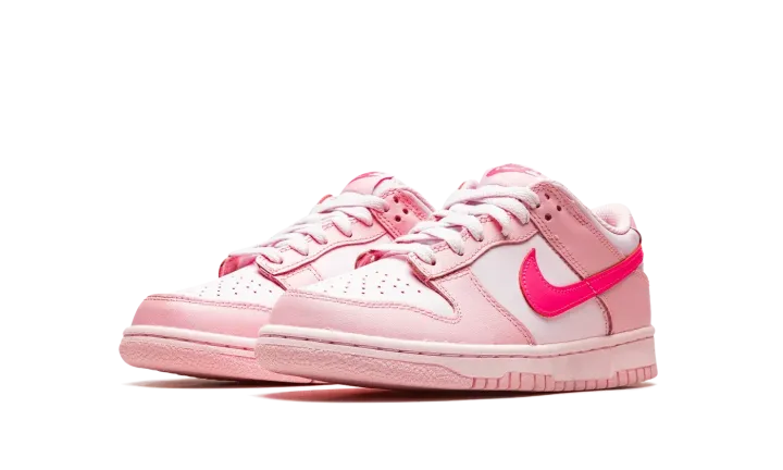 The Nike Dunk Low GS "Triple Pink" is the youth sizing of the vintage basketball shoe in a colorway featuring various shades of pink. The "Triple Pink" features light pink leather on the perforated toe, mid-panel, collar, and heel. The overlays are designed in a medium shade of pink leather. A neon pink leather Swoosh is found on both sides of the shoe. The same shade of pink appears on the "Nike" branding embroidered on the heel and the "Nike" and Swoosh detailing on the tongue tag. The shoe's all-pink appearance is continued on the midsole and outsole.