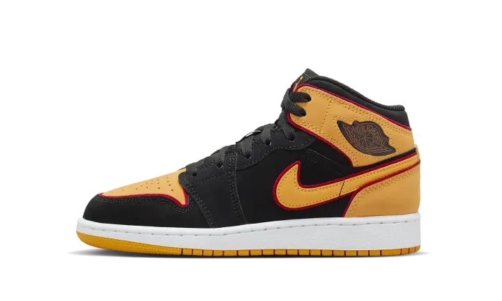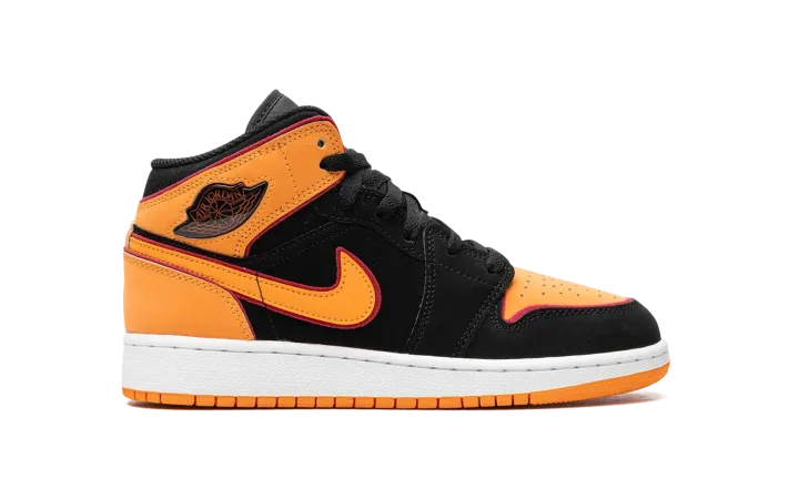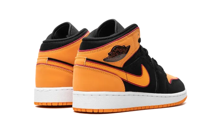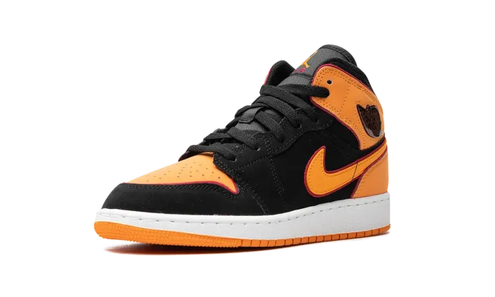 The Air Jordan 1 Mid GS "Vivid Orange" is the youth sizing of the colorway of the mid-top sneaker with orange and red accents. The "Vivid Orange" Jordan 1 Mid is complete with a black synthetic nubuck base with tonal overlays on the toe, forefoot, and eyelets. Vivid Orange accenting is seen on the perforated leather toe, collar, heel, and Swoosh. The orange panels are outlined with red. The blazing shade of orange can also be found on the Jumpman logo on the tongue. A white rubber midsole and orange outsole complete the look. Release date: August 31, 2023