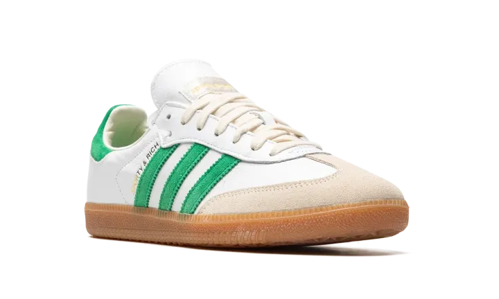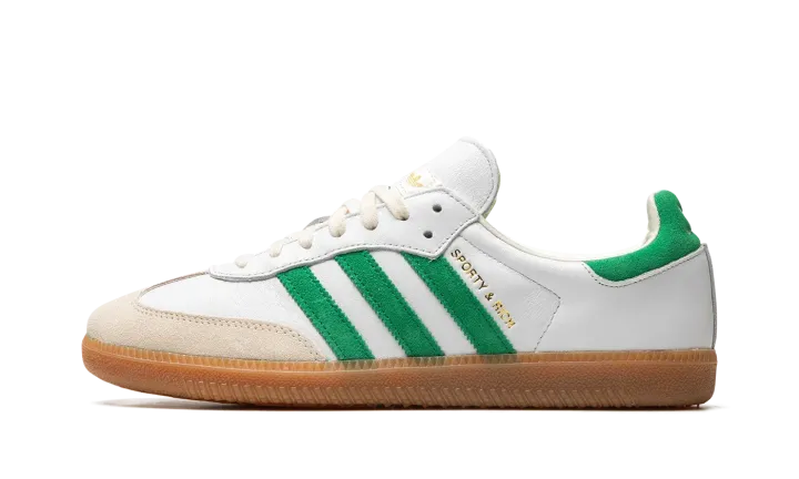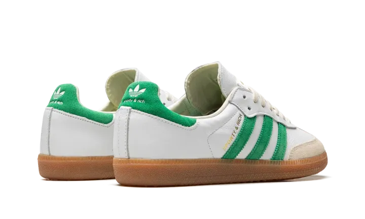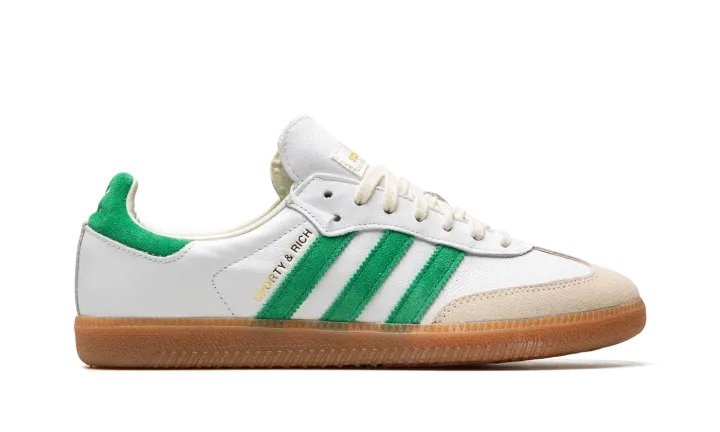 The Sporty and Rich x adidas Samba is a collaboration between Emily Oberg's sportswear brand and adidas on the ultra popular lifestyle shoe. The Sporty and Rich co-designed adidas Samba features a white leather base with a tan suede overlay on the toe. A green suede Three Stripes logo appears on the side, as does gold "Sporty and Rich" branding. Dual "adidas" and "Sporty and Rich" detailing is found on the green suede heel tab. Classic adidas Samba branding dots the tongue. A gum rubber sole completes the look. Release date: November 22, 2022