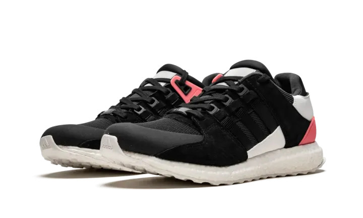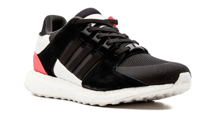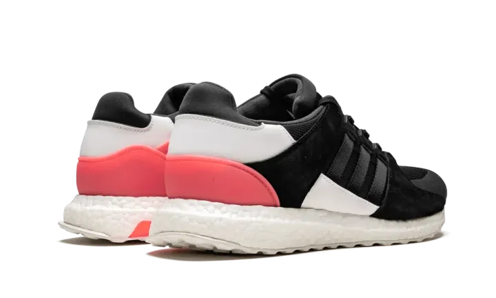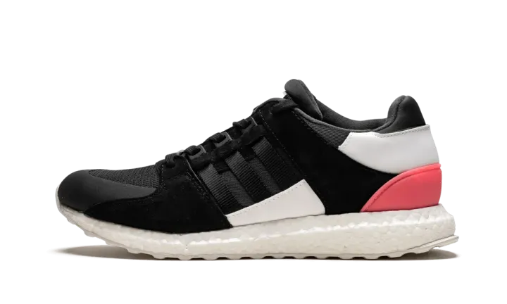 This adidas EQT Support Ultra Boost was released as part of the company's "Turbo Red" collection. For this model, the Turbo Red accents the shoe with a colorful heel counter and cage panel on the inside of the foot, with the base colorway combining Core Black and white. Along with the modern Ultra Boost technology, adidas paired classic EQT elements like the webbed Three Stripes lacing system, the asymmetric tongue, and the comination of mesh and nubuck in the upper's construction.
