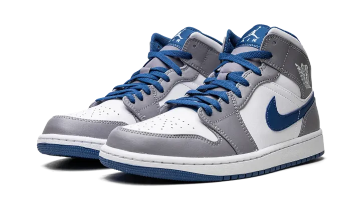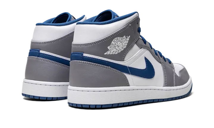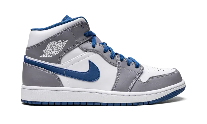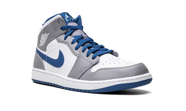 The Air Jordan 1 Mid "Cement Grey/True Blue" is a neutral colorway of the popular lifestyle shoe that was released in 2022. Appearing in "Cement Grey/True Blue," the Jordan 1 Mid is complete with a white leather base with contrasting Cement Grey leather overlay panels. A True Blue leather Swoosh is located on either side of the shoe and a white "Wings" logo is found on the collar. Jumpman and "Air" detailing appears on the blue nylon tongue tag. A white rubber midsole and blue outsole complete the look.