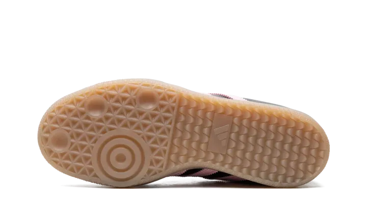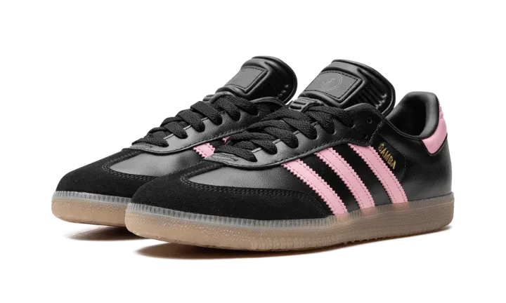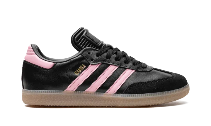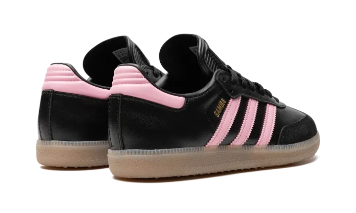 The adidas Samba OG "Inter Miami - Black" is a colorway of the popular retro shoe inspired by the Major League Soccer team. Also said to be inspired by Inter Miami's star player, football (soccer) legend Lionel Messi, the "Inter Miami" features the colors of the Miami-based team on its design. The upper has a black leather construction with pink leather Three Stripes branding. A gold "Samba" logo appears on the lateral side of the mid-panel, while detailing inspired by Inter Miami is located on the tongue. A semi-translucent, smoky Gum rubber sole completes the look.