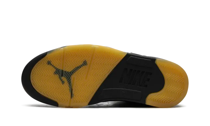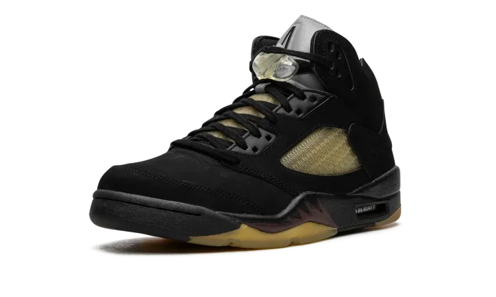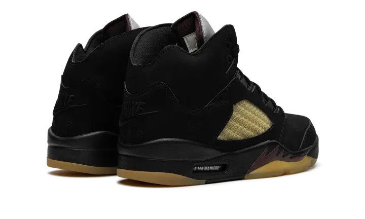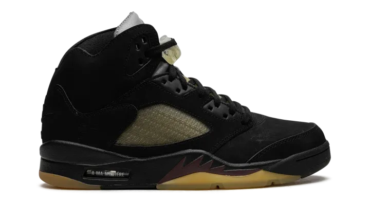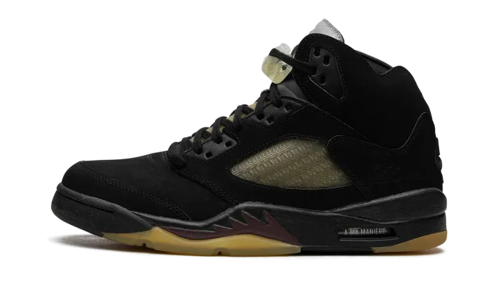 The A Ma Maniére x Air Jordan 5 SP "Black" is a collaboration by James Whitner's boutique on a colorway of Michael Jordan's fifth signature shoe with vintage details. Since the late 2010s, A Ma Maniére has been one of the most successful collaborators in the sneaker space, having worked with Jordan Brand on several now-classic Jordan sneakers on multiple occasions. As for the design of this shoe, the upper features a black nubuck construction with pre-aged netting on the tongue and mid-panel designed in an "A" pattern after A Ma Maniére's logo. The retailer's branding can also be found on the "A" logo on the silver reflective tongue of the left shoe while a black Jumpman is embroidered on the tongue of the right shoe. Classic "Nike Air" detailing is embroidered on the heel and Jordan's "23" jersey number is debossed on the lateral side of the heel. A yellow-tinted lace lock continues the shoe's vintage look, as does the pre-aged, semi-translucent outsole underneath the black midsole with maroon shark tooth detailing. Release date: November 22, 2023