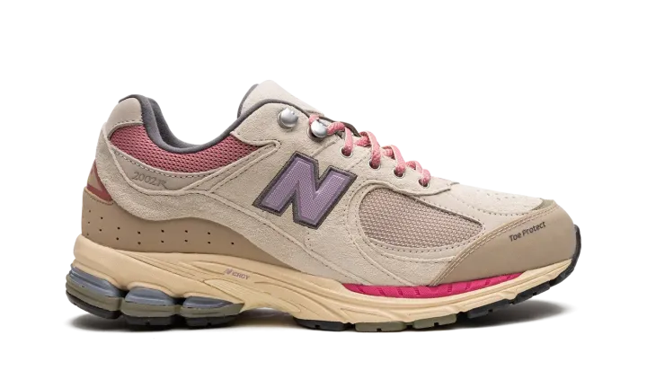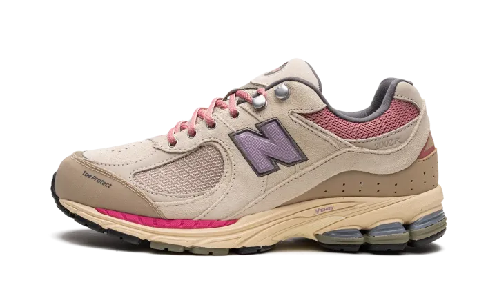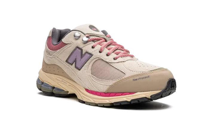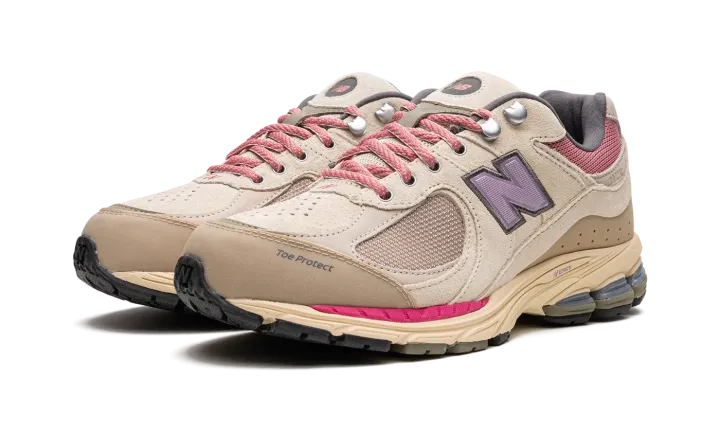 The New Balance 2002R "Hiking Pack - Beige" is a colorway of the retro performance running shoe from the outdoors-inspired collection. The "Beige" edition of the 2002R, as its name implies, features a tan mesh base and tonal suede overlays. Pink mesh appears on the collar. A purple textile "N" logo is found on the sides. Additional details include metal upper eyelet hooks, a reinforced toe, and an ABZORB cushioned midsole heel with "N-ERGY" technology. Release date: June 18, 2022