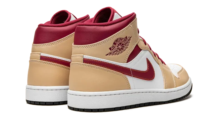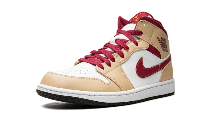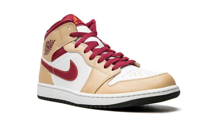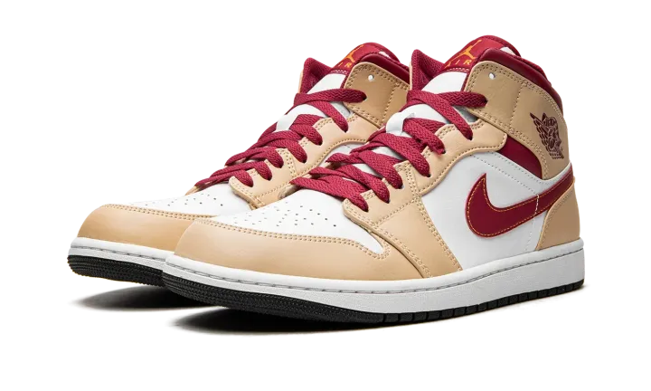 The Air Jordan 1 Mid "Light Curry" is another casual colorway of the popular silhouette that can be worn with virtually anything it's paired with. The "Light Curry" features a white leather base with Light Curry leather overlays throughout the design. A maroon leather Swoosh appears on either side of the shoe. Additional maroon accenting comes into play on the "Wings" branding on the collar, on the tongue tag with Jumpman insignia, and on the laces. A white midsole and black rubber outsole complete the look. Release date: April 26, 2022