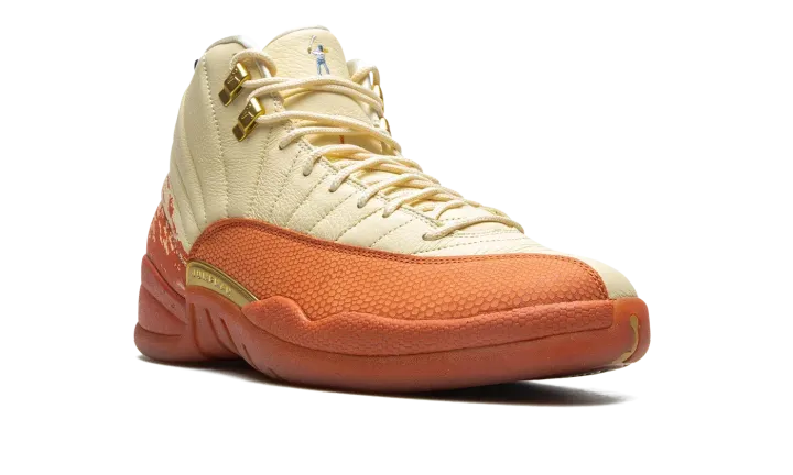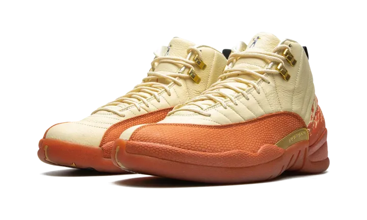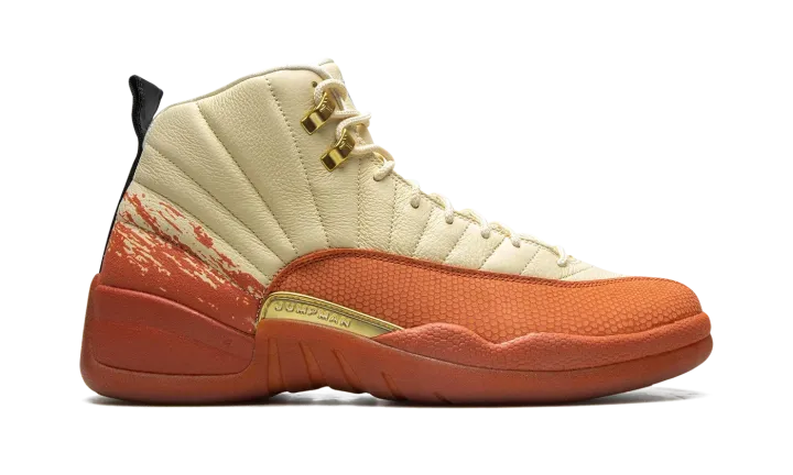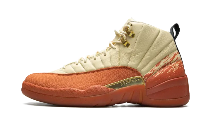 The Eastside Golf x Air Jordan 12 "Out of the Clay" is a collaboration on Michael Jordan's twelfth signature basketball shoe by the inspirational golf brand. Eastside Golf is a lifestyle golf brand that aims to raise awareness of golf with a younger generation of athletes. On the Jordan 12 "Out of the Clay," Eastside Golf revamps the shoe's design in a unique way with a cream leather upper that's matched with a faux lizard-textured mudguard in Burnt Sunrise. A clay-inspired splattered graphic is found on the heel. Eastside Golf's signature branding appears on the tongue. Nods to golf are found on the bottom of the shoe, with green grass appearing on the outsole of the left shoe while clay dirt is found on the outsole of the right shoe. Release date: November 12, 2022