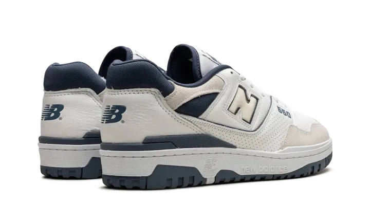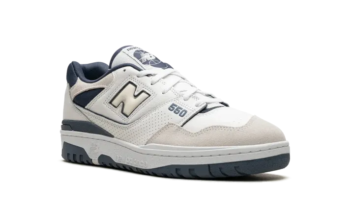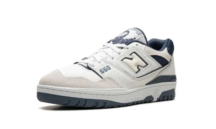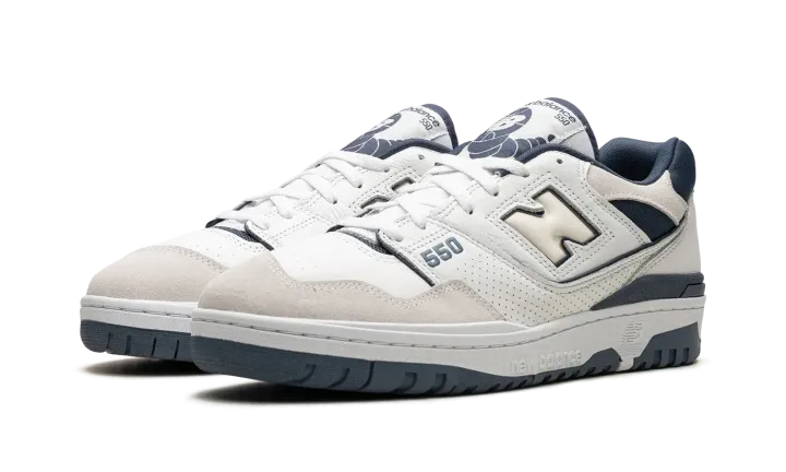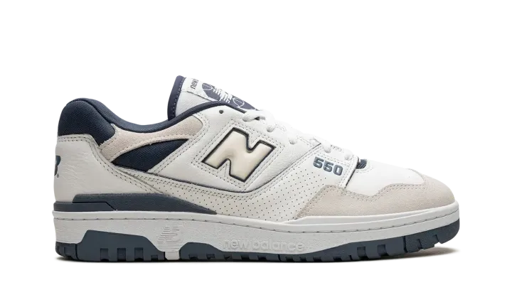 The New Balance 550 "Vintage Indigo" is a classic and versatile colorway of the retro basketball shoe. The 550 in the "Vintage Indigo" style features a white leather construction with a light grey suede overlay on the toe. A cream "N" logo appears on the side. Additional branding includes Vintage Indigo-colored "550" detailing appears on the forefoot, "NB" text on the heel, and "New Balance 550" graphic on the tongue. The Vintage Indigo mesh collar is contrasted with a light grey suede overlay. Underfoot, the white rubber midsole is paired with a navy rubber outsole. Release date: June 21, 2023
