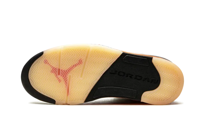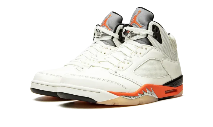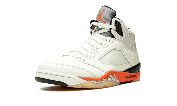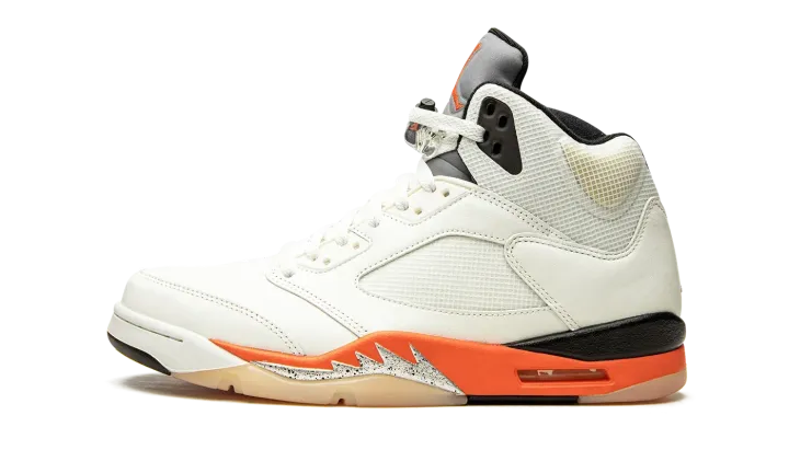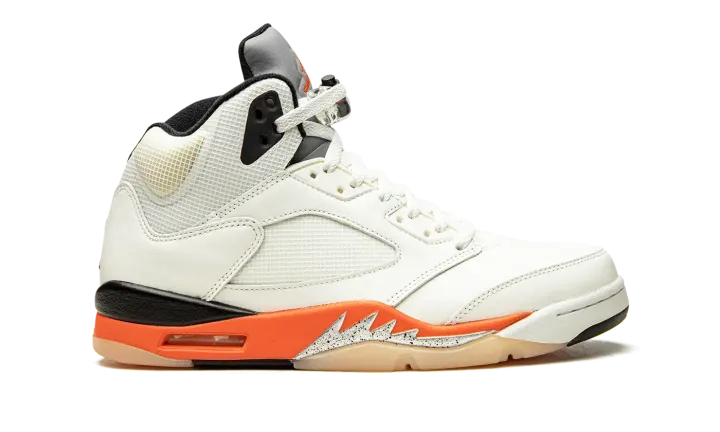 The Air Jordan 5 "Shattered Backboard" or "Orange Blaze" updates Michael Jordan's fifth signature shoe in a colorway first seen on the Air Jordan 1 back in 2015. The "Shattered Backboard" theme is inspired by team uniforms worn by Jordan during an oversea exhibition game in Italy in 1985 when he famously shattered a glass backboard following a powerful dunk. The Jordan 5's version of the "Shattered Backboard" makes use of the same white, black, and orange color scheme as every "Shattered Backboard" Air Jordan before it, albeit in a unique way. Sail leather appears on the upper while the collar, quarter panel, and lower tongue are constructed in a fine mesh material that appears on the Jordan 5 for the first time on this colorway. The top of the tongue, which displays an Orange Blaze Jumpman, is treated to the same reflective silver finish as the Jordan 5's original construction. A black Jumpman is stitched onto the heel. Silver shark tooth detailing is found on the orange painted midsole. Release date: October 2, 2021
