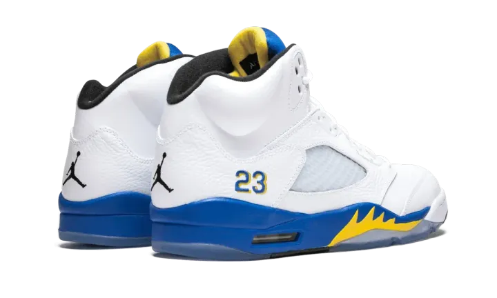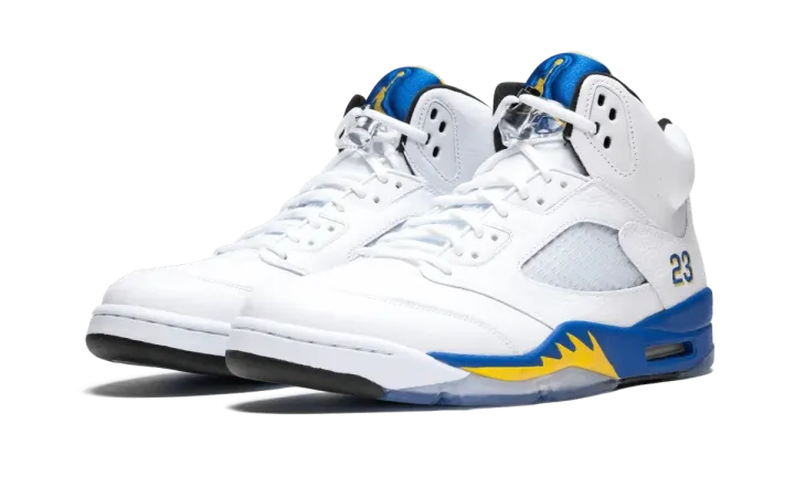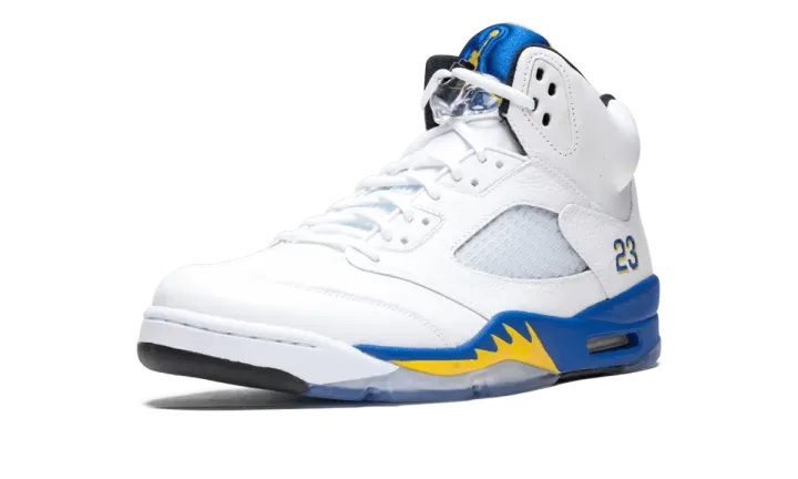 Supplied by a premier sneaker marketplace dealing with unworn, already sold out, in demand rarities. Each product is rigorously inspected by experienced experts guaranteeing authenticity. Based off the team colors of Michael Jordan's high school, this "Laney" Air Jordan 5 features a white leather upper with royal blue and yellow accents. First released in 2000 and then again in 2013, it has gone down as one of the all-time classic Air Jordan 5 colorways.