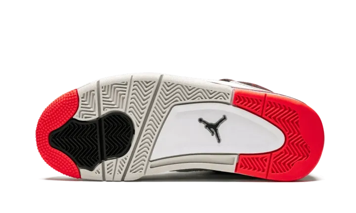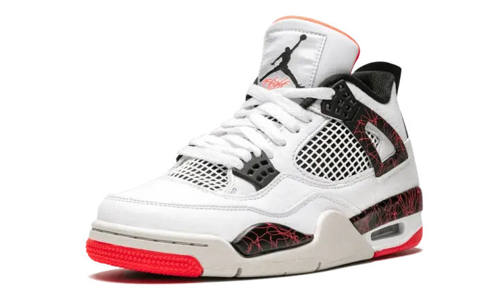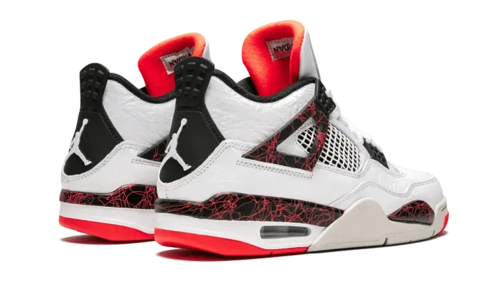 The Air Jordan 4 "Bright Crimson/Pale Citron" is a 2019 release of the iconic silhouette in a vibrant colorway. Inspired by the era when Michael Jordan's fourth signature shoe first released, the classic model features a late '80s aesthetic, constructed in white leather with black and Bright Crimson accents. A Bright Crimson paint splatter effect is added to the triangular "wings" on the upper as well as on the midsole for added flair. Light grey rubber on the midsole and outsole add a vintage look to colorway and help emphasize the throwback theme. The Air Jordan 4 "Bright Crimson/Pale Citron" released in March 2019.